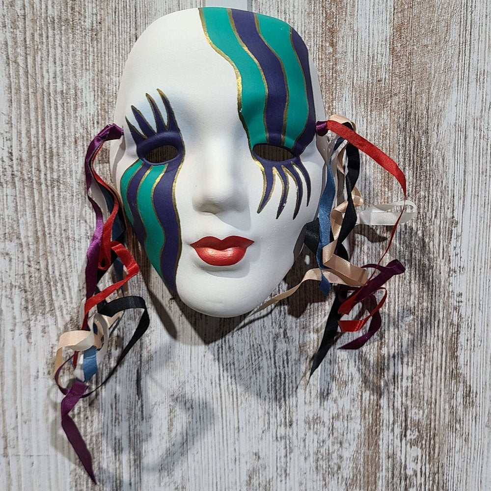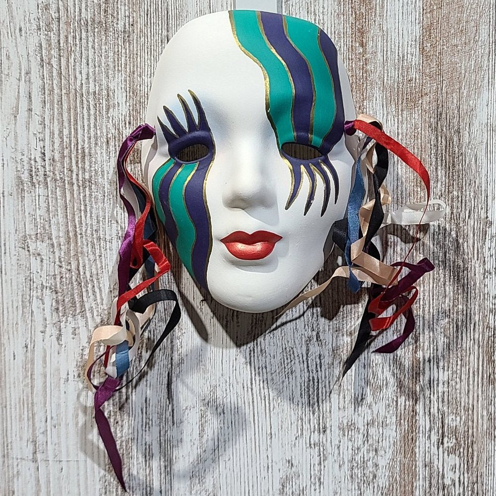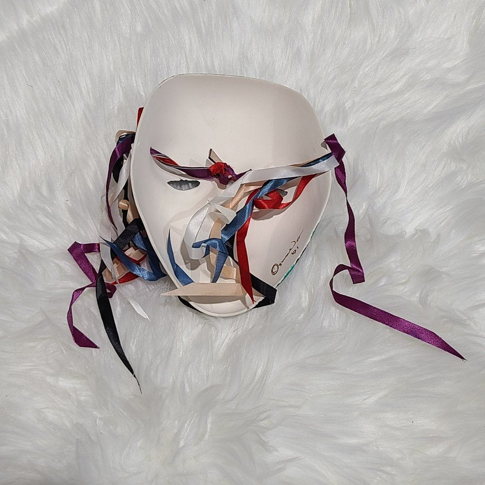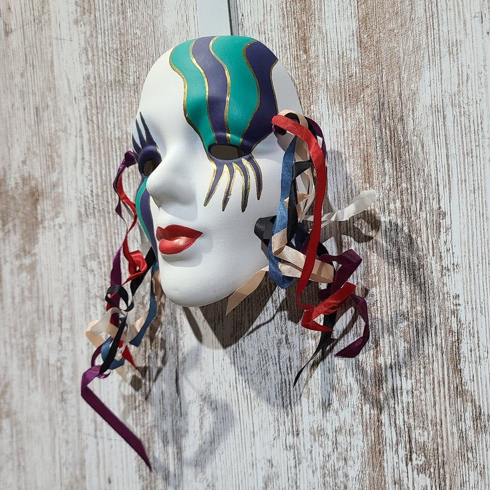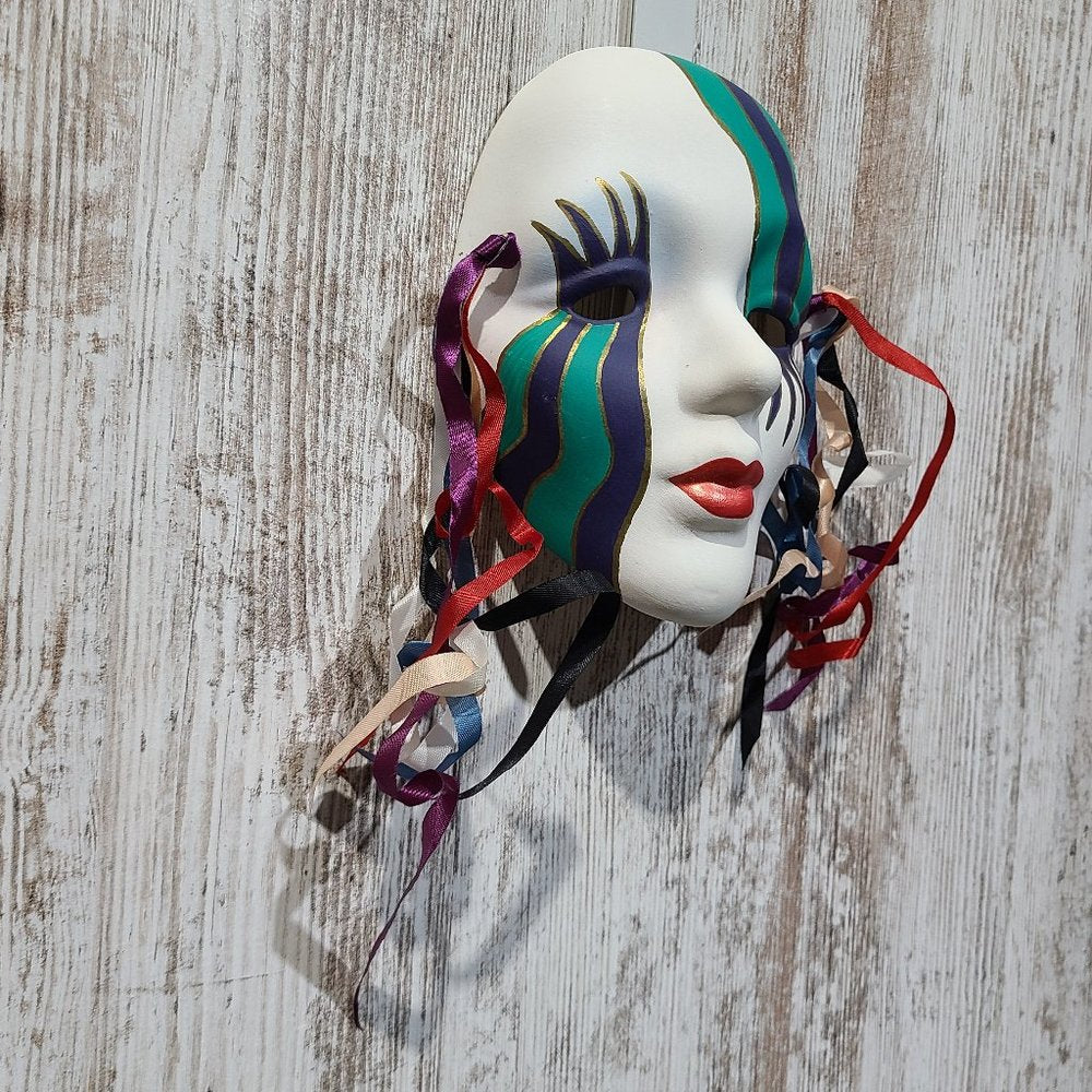 This is a very rare vintage hanging wall mask. This mask was hand painted in 1991. The dimensions of the entire mask, including the hanging ribbons, are 7in. x 3in. x 11in. (l x w x h) The dimensions of the clay mask itself, not including the hanging ribbons, are 7in. x 3in. x 7in. (l x w x h) It weighs 3.6oz. The only minor damages are small spots of paint thinning due to the year it was made, on the gold stripes, as shown in the photos, which are very unnoticeable. **Brand new without tags, display model, not in original box or packaging. 100% authenticity guaranteed backed by our full reimbursement policy.**