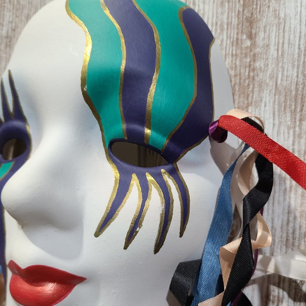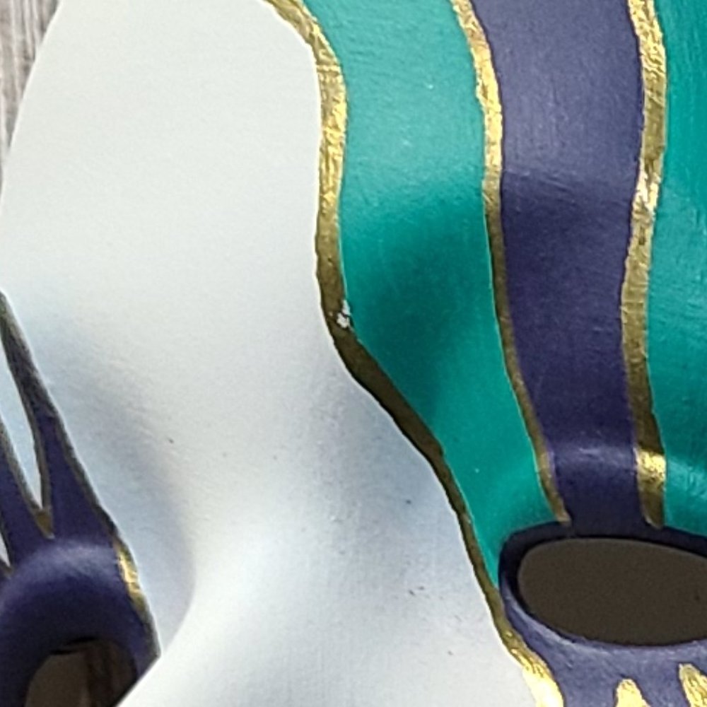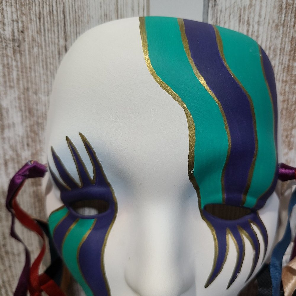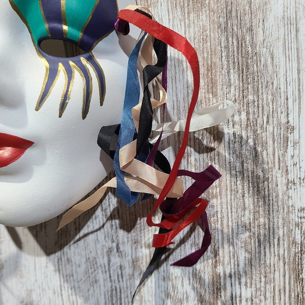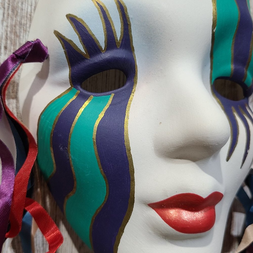 This is a very rare vintage hanging wall mask. This mask was hand painted in 1991. The dimensions of the entire mask, including the hanging ribbons, are 7in. x 3in. x 11in. (l x w x h) The dimensions of the clay mask itself, not including the hanging ribbons, are 7in. x 3in. x 7in. (l x w x h) It weighs 3.6oz. The only minor damages are small spots of paint thinning due to the year it was made, on the gold stripes, as shown in the photos, which are very unnoticeable. **Brand new without tags, display model, not in original box or packaging. 100% authenticity guaranteed backed by our full reimbursement policy.**