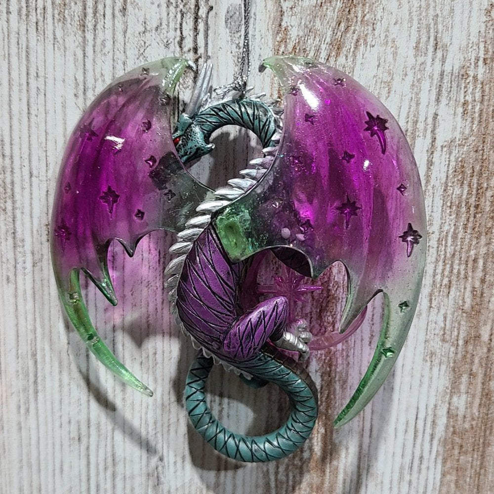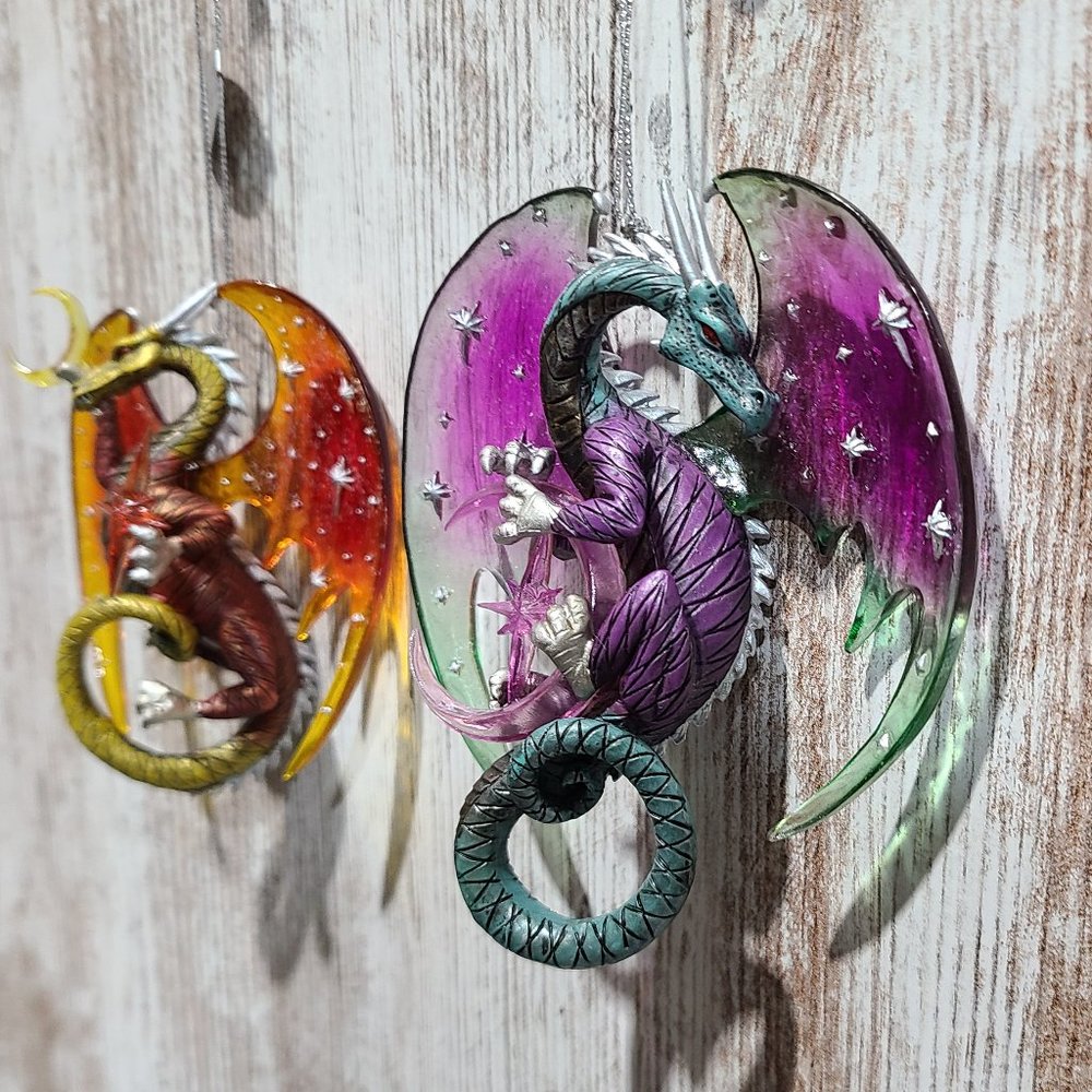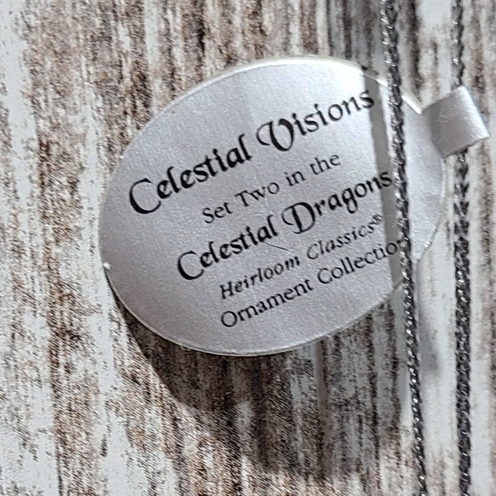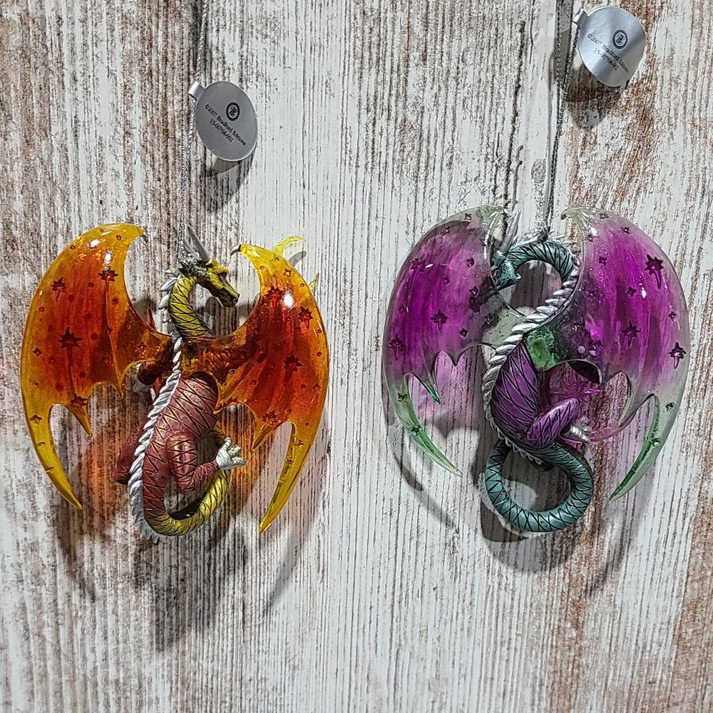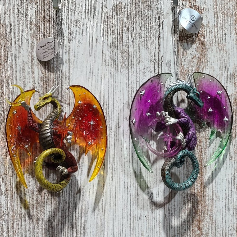 One set of two vintage, rare, collectible Celestial Dragon Ornaments. "Celestial Visions" and "Galaxy Guardian" are the Second Issue in the Celestial Dragons Heirloom Classics Ornament Collection. Each fine collectible is strictly limited to 120 casting days and is crafted to meet or exceed the strictest quality standards of the Bradford Editions." Each dragon is meticulously handcrafted and hand-painted in vibrant hues of pulsating purple, green tinted teals, hot fiery oranges and reds. Each ornament is approximately 4in. x 1in. x 5in. (l x w x h). These items are brand new with tags attached.