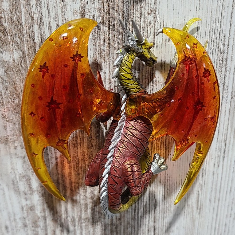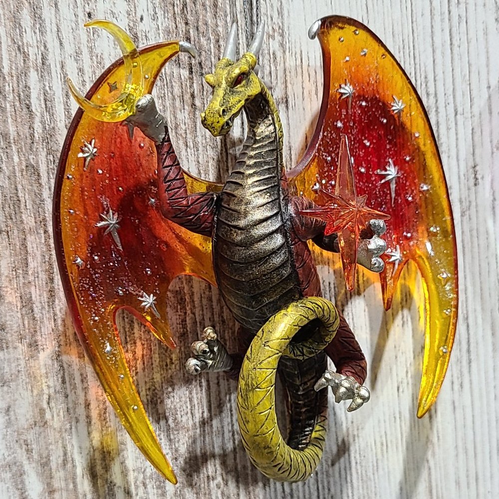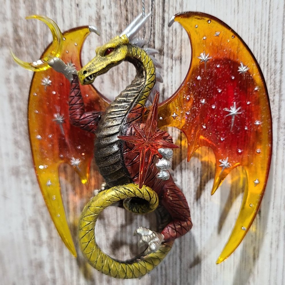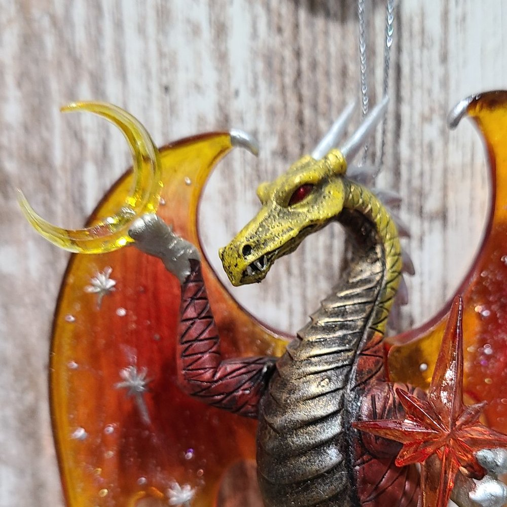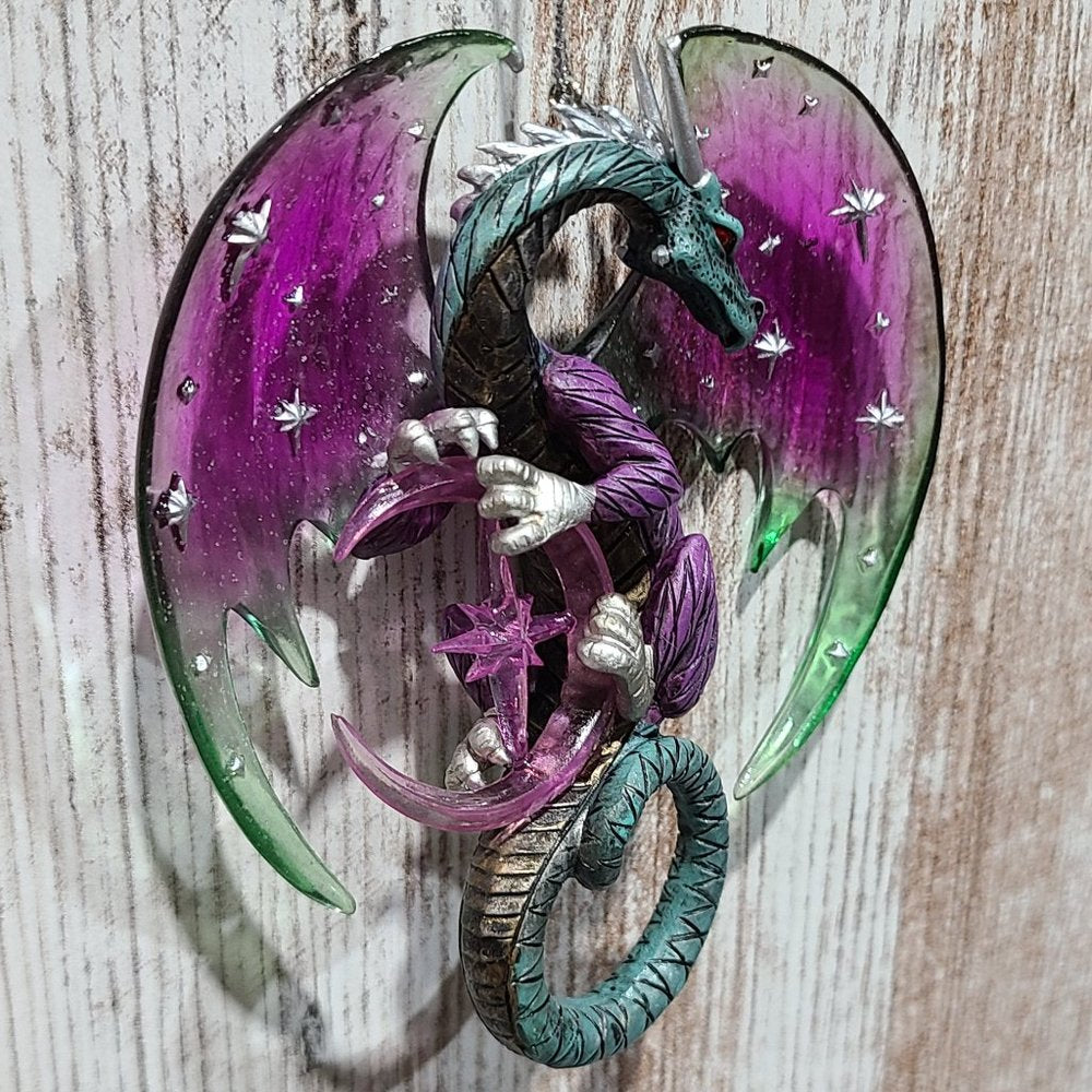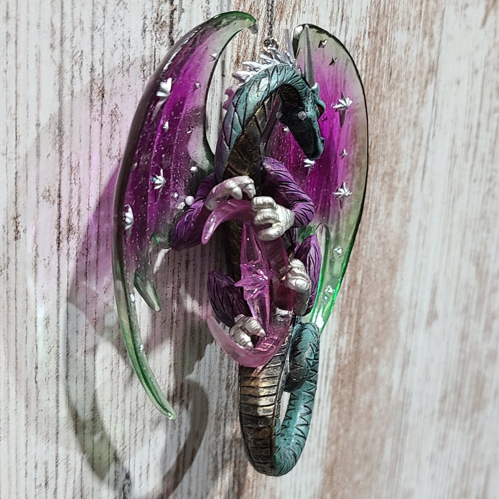 One set of two vintage, rare, collectible Celestial Dragon Ornaments. "Celestial Visions" and "Galaxy Guardian" are the Second Issue in the Celestial Dragons Heirloom Classics Ornament Collection. Each fine collectible is strictly limited to 120 casting days and is crafted to meet or exceed the strictest quality standards of the Bradford Editions." Each dragon is meticulously handcrafted and hand-painted in vibrant hues of pulsating purple, green tinted teals, hot fiery oranges and reds. Each ornament is approximately 4in. x 1in. x 5in. (l x w x h). These items are brand new with tags attached.