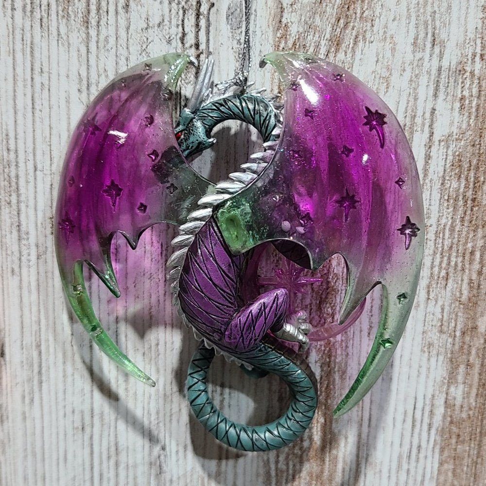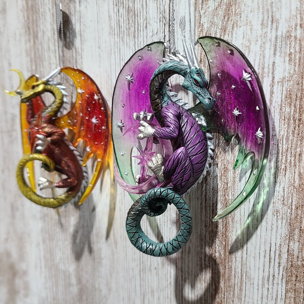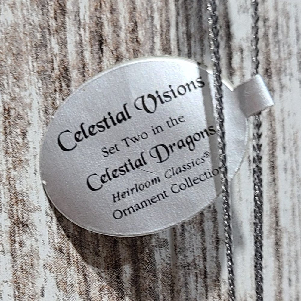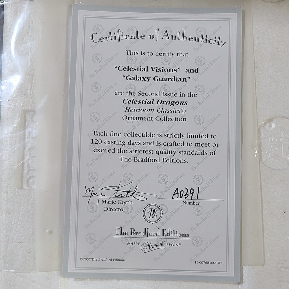 One set of two vintage, rare, collectible Celestial Dragon Ornaments. Certificate of Authenticity included stating "This is to certify that "Celestial Visions" and "Galaxy Guardian" are the Second Issue in the Celestial Dragons Heirloom Classics Ornament Collection. Each fine collectible is strictly limited to 120 casting days and is crafted to meet or exceed the strictest quality standards of the Bradford Editions. Signed by director J. Marie Korth. Each dragon is meticulously handcrafted and hand-painted in vibrant hues of pulsating purple, green tinted teals, hot fiery oranges and reds. Each ornament is approximately 4in. x 1in. x 5in. (l x w x h). These items are brand new, in original packaging, with tags attached.