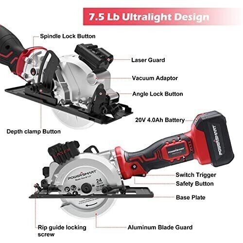 - POWERFUL & EFFICIENT: PowerSmart cordless circular saw comes with no load speeds up to 4,500 RPM for multi-purpose cuts of wood, soft metal, tile, drywall, plastic and more without hassles. Powerful battery circular saw substantial enough to cut through nominal 2-inch lumber and no cord limited for excellent maneuverability and portability. Best for working in tight spaces and meeting requirements of any outdoor job site.