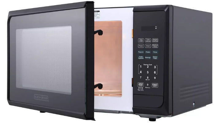 Black + Decker 1.1 Cu. Ft. 1000 Watt Microwave Oven - Stainless Steel EM031M2CE. This BLACK + DECKER 1.1 cubic foot Stainless Steel Microwave Oven is the perfect solution for smaller kitchens with limited counter space. Heat food quickly with One Touch settings, 1000 watts of cooking power and 11 power levels in this 1.1 cubic ft. microwave. It features electronic controls and LED display which are easy to see and use. This 1000 Watt microwave oven has 6 quick set menu buttons without having to select the cook time or power level and 30 second express cooking. It also contains a setting for weight and time defrost.