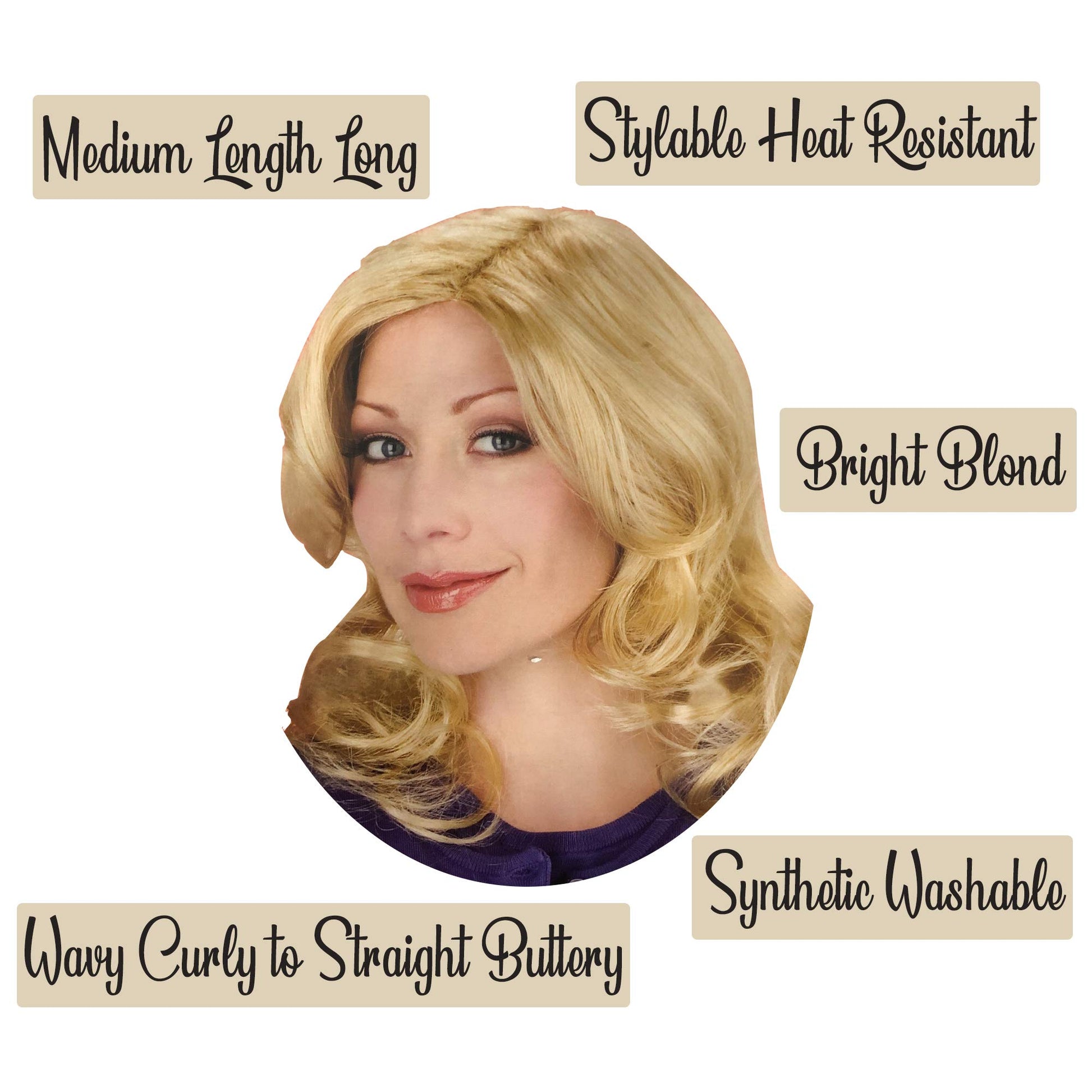 Blonde Wig Womens Costume Dress Up Medium Length Long Hair Wavy Curly Synthetic Washable Stylable Heat Resistant Yellow