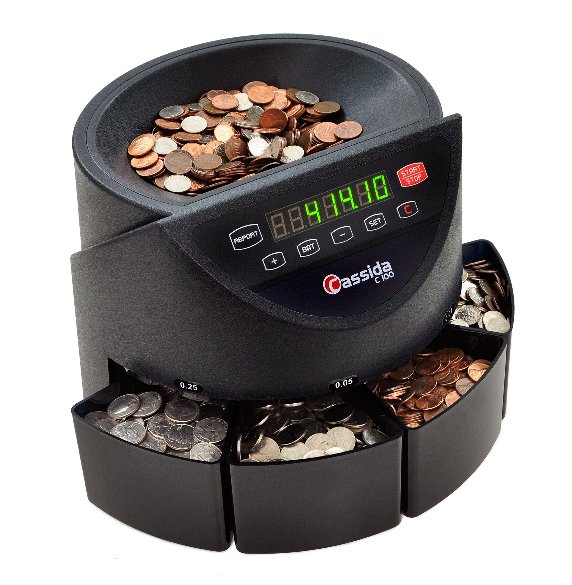 Cassida C100 Electronic Coin Sorter/Counter, Countable Coins 1¢, 5¢, 10¢, 25¢, 250 Coins/min, 110 VAC