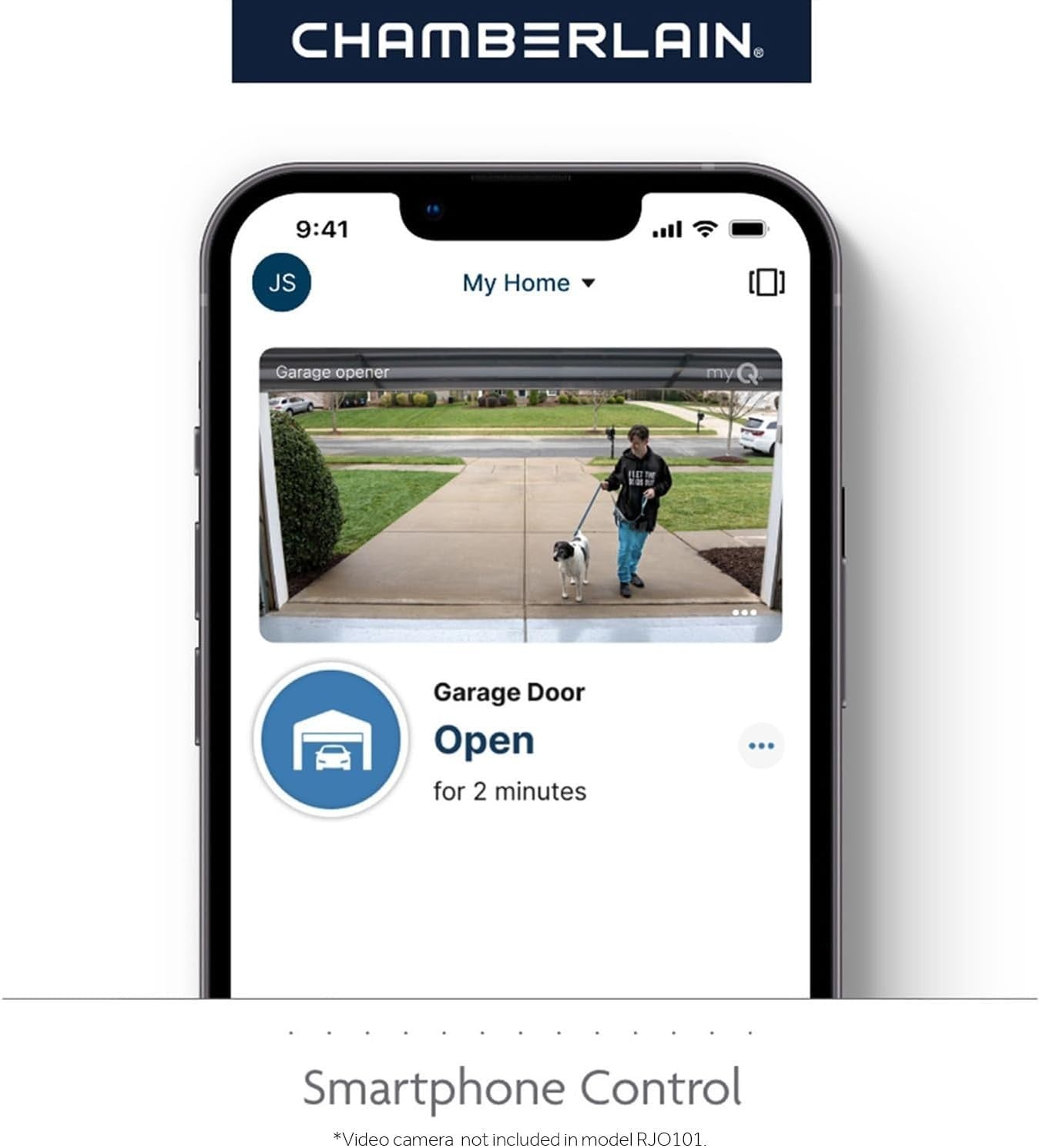 The CHAMBERLAIN RJO101MC Ultra-Quiet Wall Mounted Garage Door Opener is a modern and stylish addition to any residential home. With a maximum door weight of 1000 lbs and a battery backup function, this electric opener ensures reliable performance even during power outages. The myQ app smart home compatibility allows for convenient control and monitoring, while the Wi-Fi smart home protocol provides added convenience. This garage door opener from Chamberlain is designed for easy wall mounting and features LED lights for enhanced visibility.