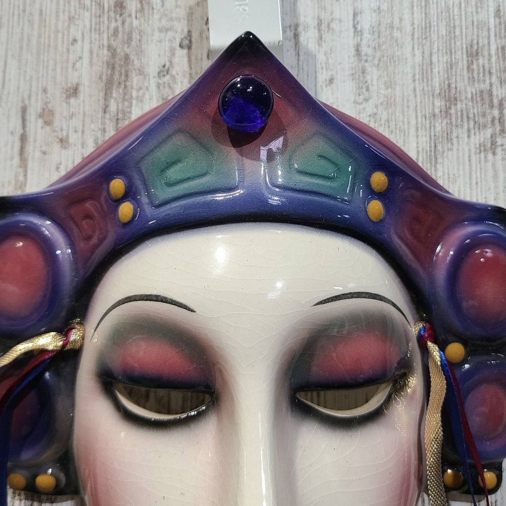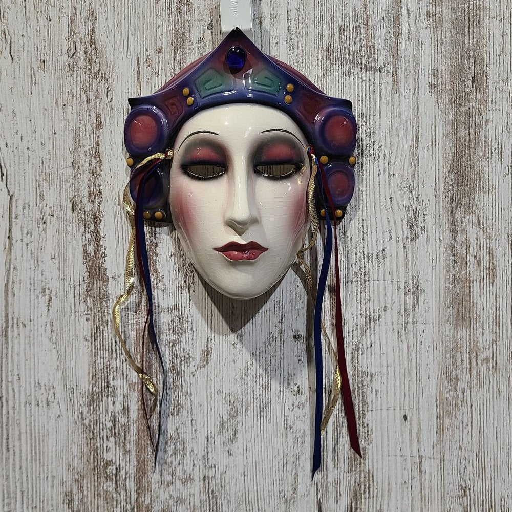 Clay Art 1989 Vintage Lady Face Mask. This is one of over fifty collectable Clay Art Masks from the About Face Line, designed by Jenny McLain and Claudia Cohen, and handmade in San Francisco, California in the 1989. Every Clay Art Mask has a dramatic presence that brings new life to it's surroundings. The dimensions for the mask including the hanging ribbons are 14in. x 8in. x 4in. The dimensions of the mask not including the ribbons are 8in x 8in. x 4in. The upper right corner of the mask has the slightest chip as shown in pictures. **Brand new with tags, display model, not in original box or packaging. 100% authenticity guaranteed backed by our full reimbursement policy**