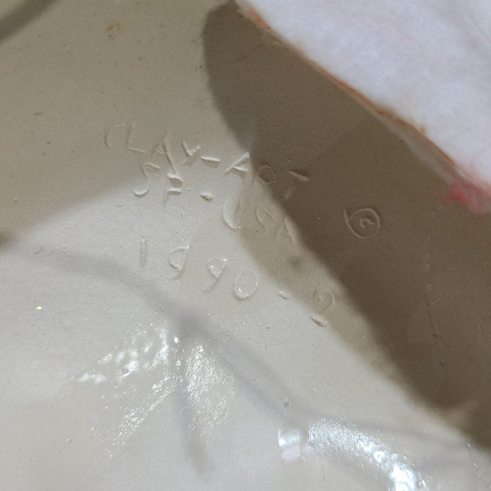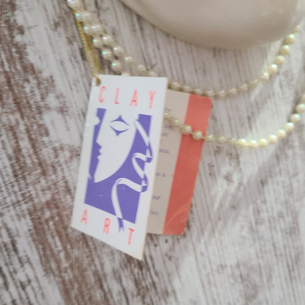 Clay Art About Face Lady's Face Mask. This is one of over fifty collectable Clay Art Masks from the About Face Line, designed by Jenny McLain and Claudia Cohen, and handmade in San Francisco, California. Every Clay Art Mask has a dramatic presence that brings new life to it's surroundings. Mask contains three pink and white fathers on flower and lace headdress. Two strands of pearls hang from mask. Wire on the back for hanging. The face portion of the mask is approximately 5in. x 8in. x 3in. Dimensions of entire mask including feathers and pearls are approximately 6in x 15in. x 3in. Brand New. **Brand new, with tags. Display model, not in original box or packaging. 100% authenticity guaranteed backed by our full reimbursement policy** Small minor scratch on right lens. Black face, brown tortoise arms.