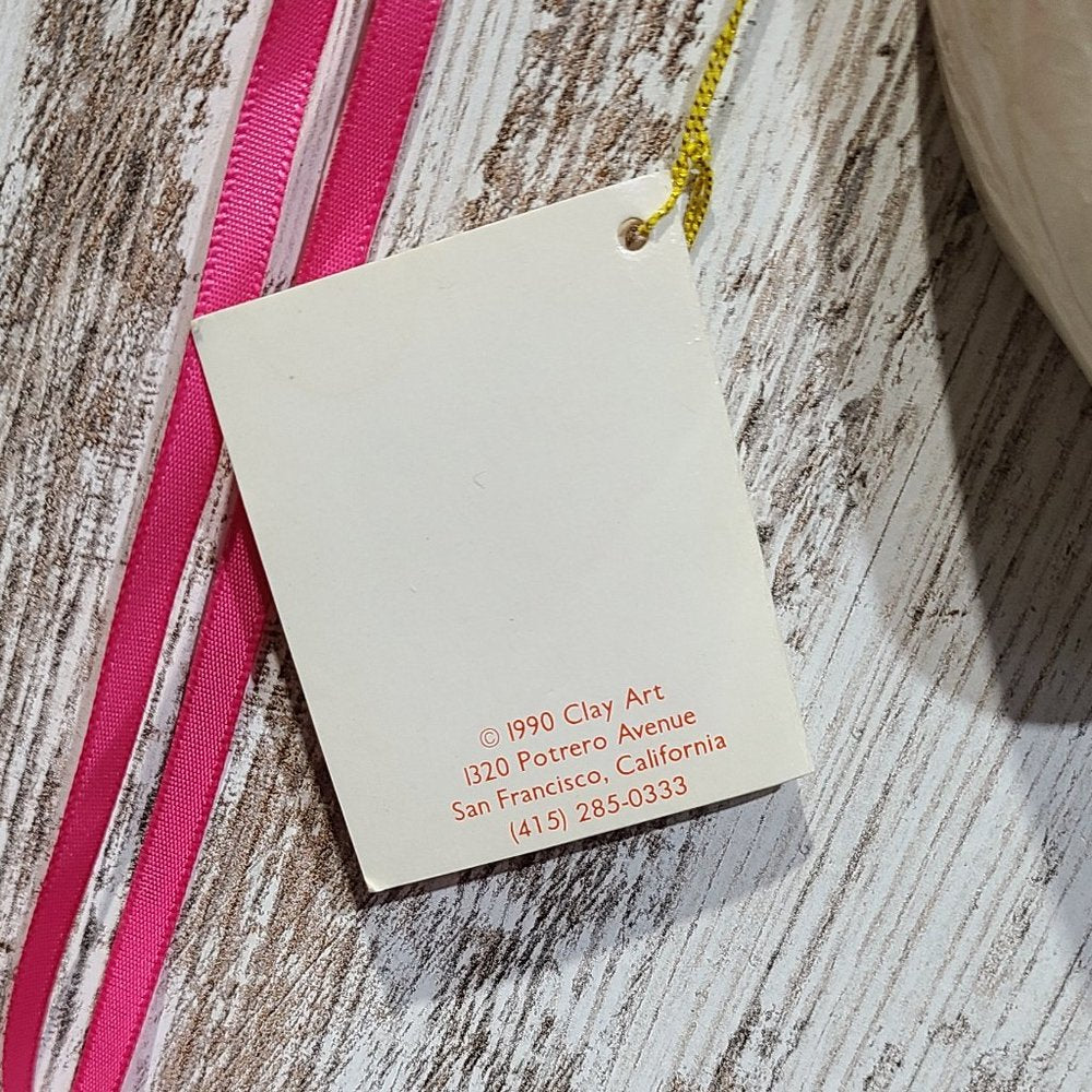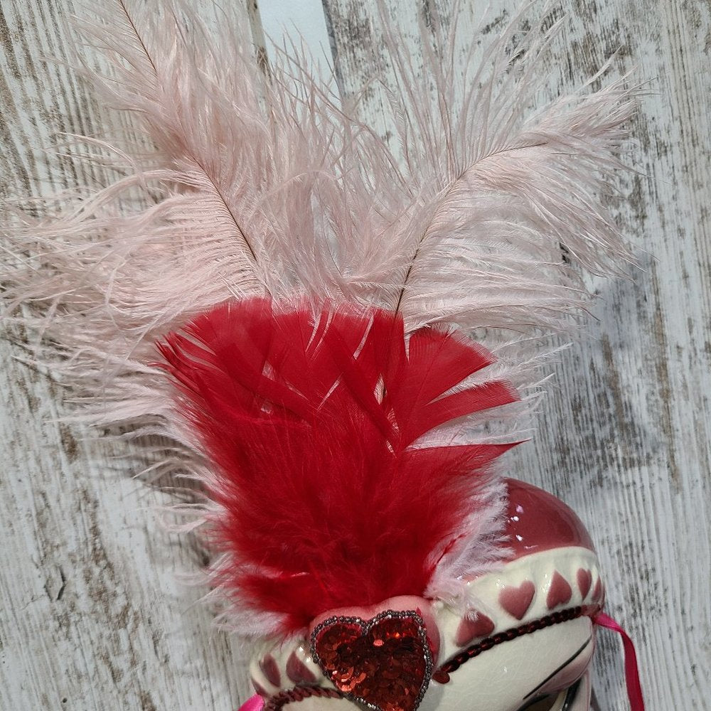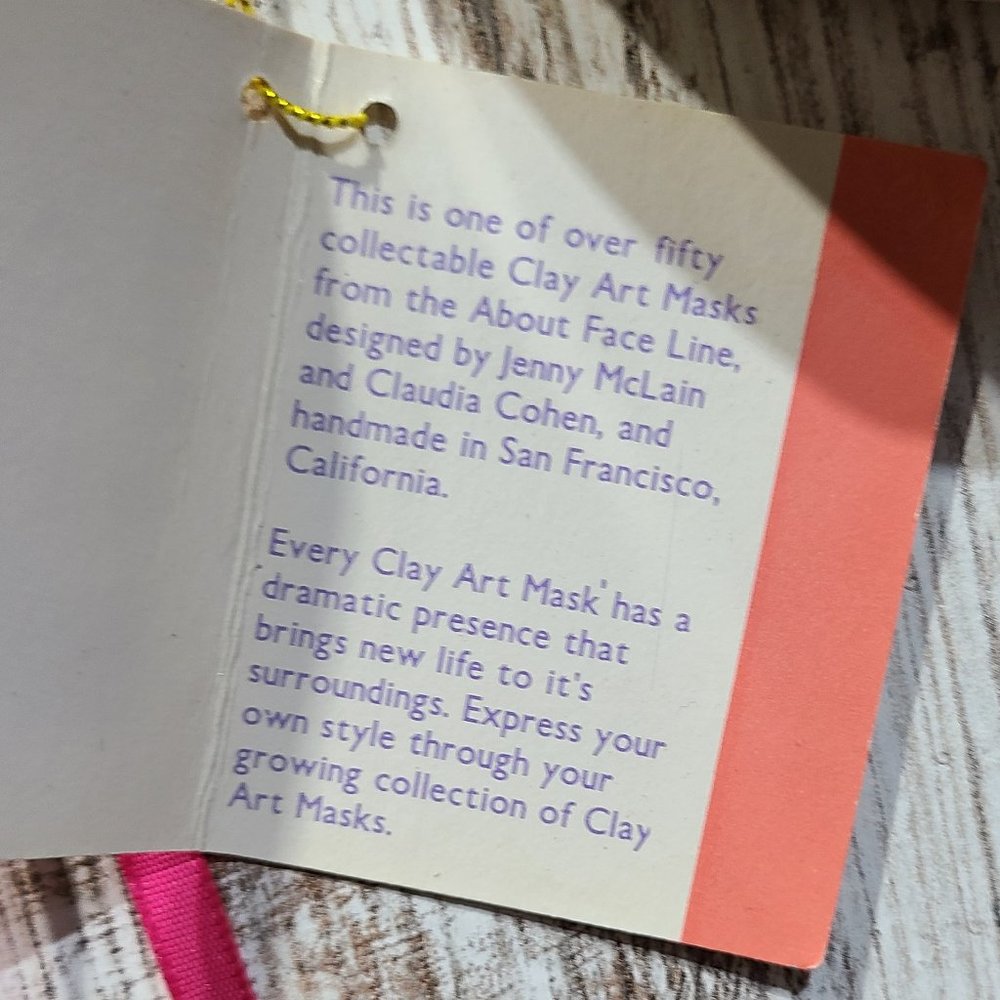 This valentine themed mask portrays a woman's face wearing a feathered headpiece. This is one of over fifty collectable Clay Art Masks from the About Face Line, designed by Jenny McLain and Claudia Cohen, and handmade in San Francisco, California in 1990. The dimensions for the entire mask, including the hanging ribbons and feathers are 7in. x 22in. x 4in. The dimensions of the clay mask itself, not including the hanging ribbons or feathers, are 7in. x 8in. x 4in. It weighs 10.5 oz. **Brand new, with tags, display model, not in original box or packaging. 100% authenticity guaranteed backed by our full reimbursement policy**