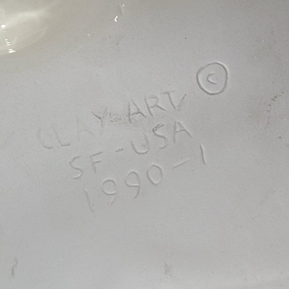 Clay Art SF-USA 1990-1 Magical Wizard Sorcerer Figurine Wall Art Hanging Mask. Handmade in San Francisco, California in 1990-1. Every Clay Art Mask has a dramatic presence that brings new life to it's surroundings. The dimensions for the mask, not including the hanging ribbons, are 8in. x 10in. x 3in. The dimensions of the entire mask including the hanging ribbons are 8in. x 15in. x 3 in. The tip of the mask's hat is missing a small rhinestone, but still has a smooth finish, so it is not a very noticeable defect.