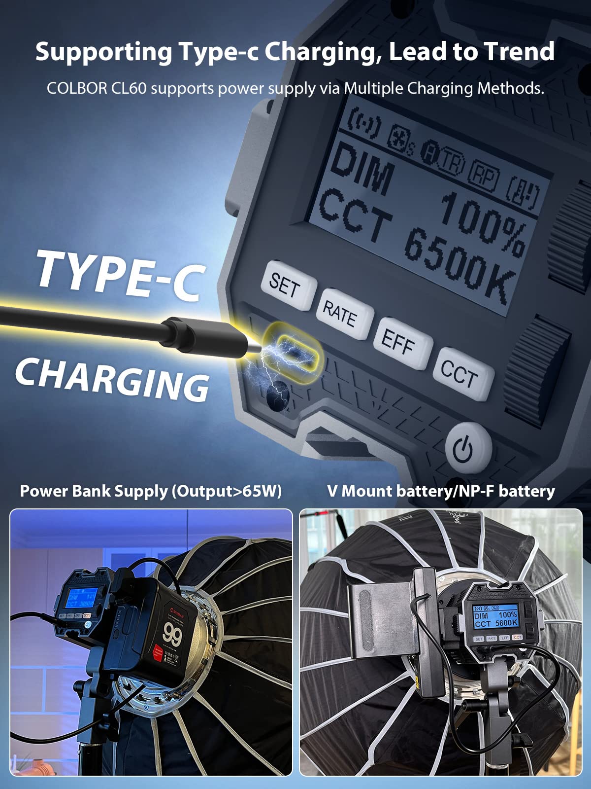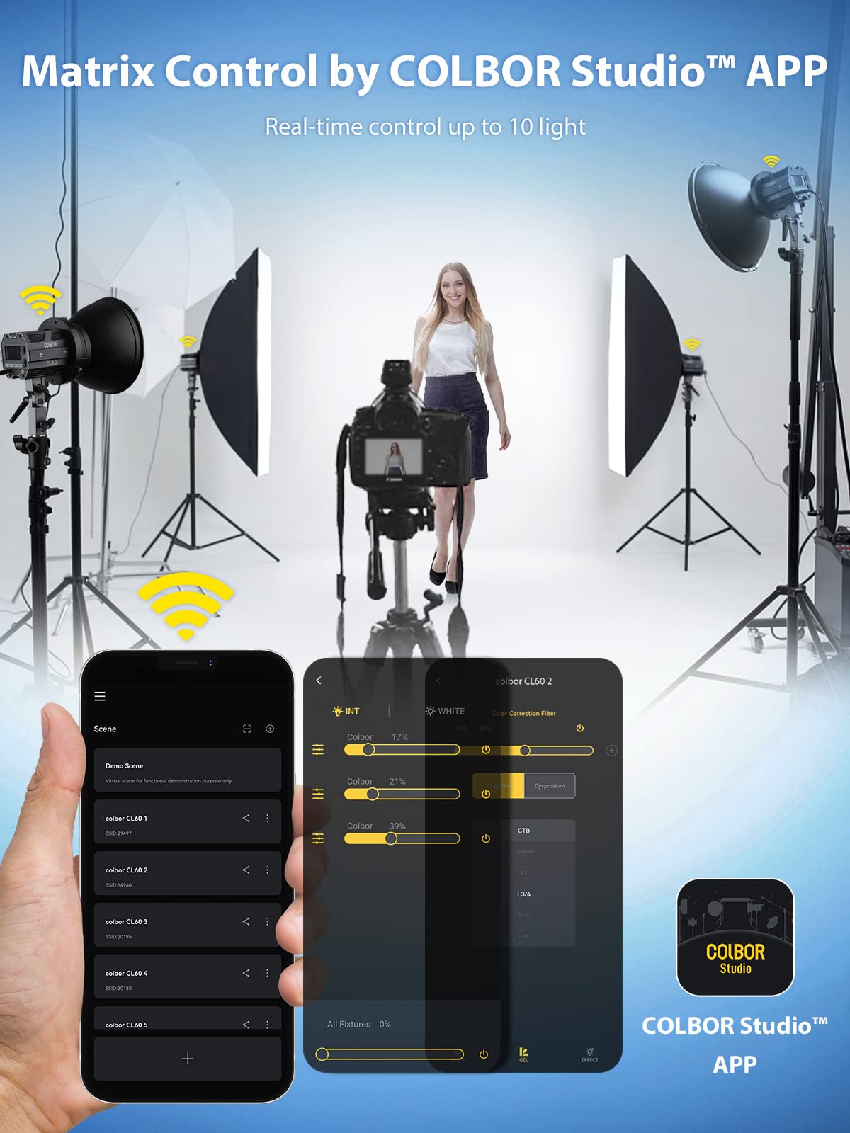 Less ThanBGreater Than65W RGB LED Light COLBOR CL60RLess Than/BGreater ThanThe COLBOR CL60R is a powerful 65W RGB LED light. A total of 10 such COBs can build a light array of up to 650W, thanks to the PowerCube design and array control shared by the CL60 series. 2700-6500K color temperature and 360-degree full color adjustment go with sound recognition function to customize lighting environment for indoor and outdoor uses. Less than 65W RGB LED Photography LightLess than/Bgreater thanThe COLBOR CL60R uses 65W COB point source LED beads, capable of maximizing the output power to 80W, delivering 2600 lux at 1 meter and even achieving a Surprisingly constant output of 22974 lux at 3.3' with the included PowerReflector. Less ThanBGreater Than10 Lights Mega PowerLess Than/BGreater ThanThe COLBOR PowerCube combines each 65W CL60R together to design a powerful array. Simply slide 10 small fixtures to see the mega power of up to 650W. Less than greater than 360 degrees of adjustable color RGBWWLess than/BGreater than In addition to the wide CCT gamut from 2700K to 6500K, CL60R offers full colors with adjustable saturation and hue ratings . Up to 3600000 colors can be displayed in HSI mode. The light intensity is also variable, from 0 to 100% to match the ambient level or serve as an adjustable key light. Less Than B Greater Than Audio Sensitive RGB LED Lightless Than/B Greater Than The CL60R has a sensitive audio system so it can "listen" to the environment