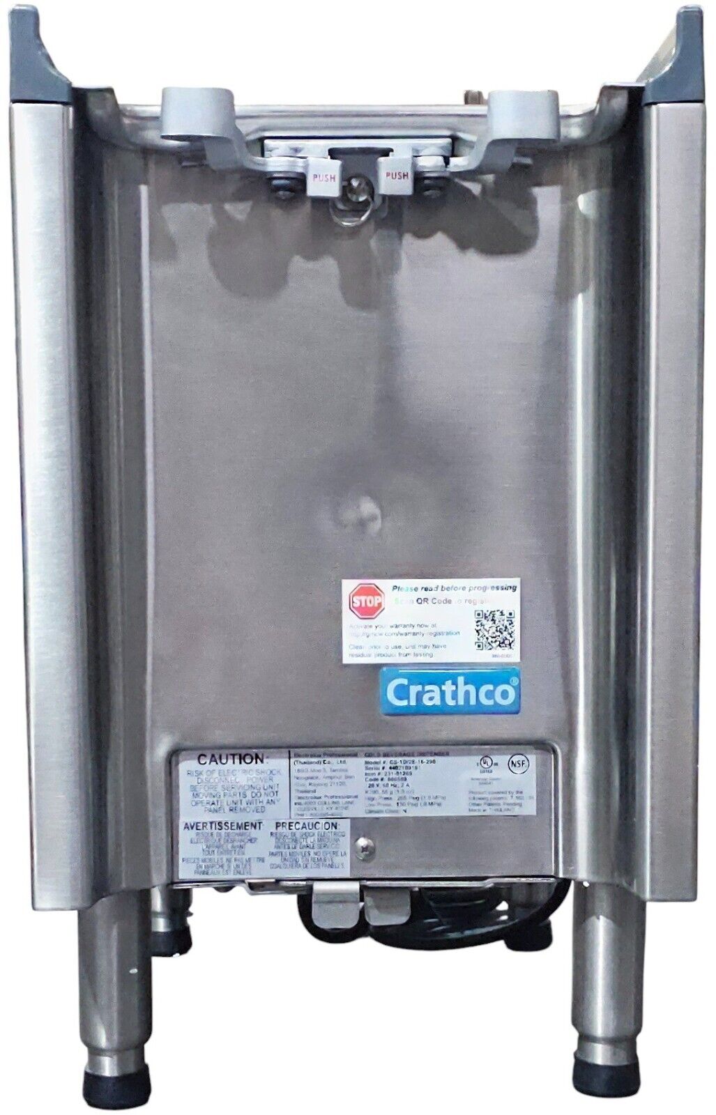 The Crathco CS-2E-16-290 cold drink machine holds, merchandises, and dispenses two beverages simultaneously. In the bottom of the bowls, agitators spin to keep the drinks mixed properly so that sediment does not settle. The base is made of stainless steel—a material that resists corrosion and increases durability. Running between 35 and 41 degrees Fahrenheit, the unit takes air in from the bottom and exhausts it out the rear.