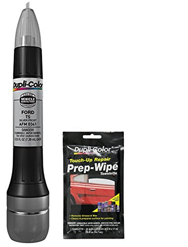 Bundle comes with: One Dupli-Color Silver Frost Ford Exact-Match Scratch Fix All-in-1 Touch-Up Paint (0.5 oz) - Use with vehicles that have the following color code: TS. Allows you to restore a scratch or chip in your vehicles finish. Abrasive prep tip removes loose paint and rust. Contains a primer (0.25 oz) and exact-color match paint (0.25 oz) in one. Clear coat will seal, protect and ensure a perfect factory matched finish Pen tip for fine scratches. Brush end for larger chips. One Dupli-Color Touch-Up Prep Wipe Towelette (8.5" x 11") - Specially formulated to remove oil, wax, grease, and other contaminants from the surface. Cleans and prepares the surface for painting.