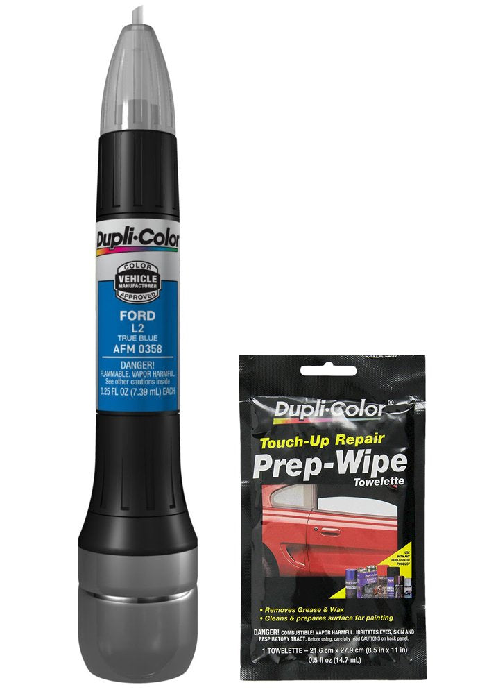 Bundle comes with: One Dupli-Color True Blue Ford Exact-Match Scratch Fix All-in-1 Touch-Up Paint (0.5 oz) - Use with vehicles that have the following color code: LT. Allows you to restore a scratch or chip in your vehicles finish. Abrasive prep tip removes loose paint and rust. Contains a primer (0.25 oz) and exact-color match paint (0.25 oz) in one. Clear coat will seal, protect and ensure a perfect factory matched finish Pen tip for fine scratches. Brush end for larger chips. One Dupli-Color Touch-Up Prep Wipe Towelette (8.5" x 11") - Specially formulated to remove oil, wax, grease, and other contaminants from the surface. Cleans and prepares the surface for painting.
