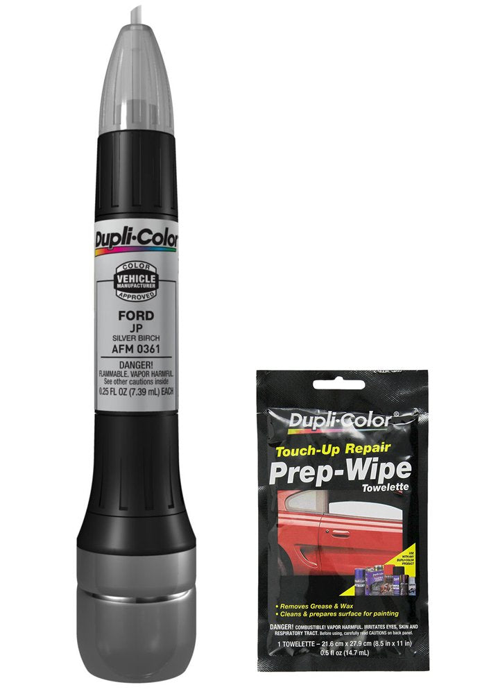 Bundle comes with: One Dupli-Color Silver Birch Ford Exact-Match Scratch Fix All-in-1 Touch-Up Paint (0.5 oz) - Use with vehicles that have the following color code: JP. Allows you to restore a scratch or chip in your vehicles finish. Abrasive prep tip removes loose paint and rust. Contains a primer (0.25 oz) and exact-color match paint (0.25 oz) in one. Clear coat will seal, protect and ensure a perfect factory matched finish Pen tip for fine scratches. Brush end for larger chips. One Dupli-Color Touch-Up Prep Wipe Towelette (8.5" x 11") - Specially formulated to remove oil, wax, grease, and other contaminants from the surface. Cleans and prepares the surface for painting.