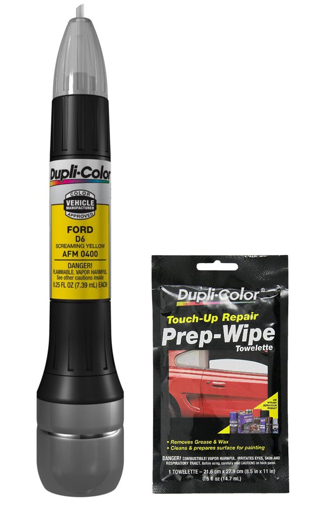 Bundle comes with: One Dupli-Color Screaming Yellow Ford Exact-Match Scratch Fix All-in-1 Touch-Up Paint (0.5 oz) - Use with vehicles that have the following color code: D6. Allows you to restore a scratch or chip in your vehicles finish. Abrasive prep tip removes loose paint and rust. Contains a primer (0.25 oz) and exact-color match paint (0.25 oz) in one. Clear coat will seal, protect and ensure a perfect factory matched finish Pen tip for fine scratches. Brush end for larger chips. One Dupli-Color Touch-Up Prep Wipe Towelette (8.5" x 11") - Specially formulated to remove oil, wax, grease, and other contaminants from the surface. Cleans and prepares the surface for painting.