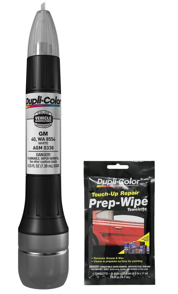 Bundle comes with: One Dupli-Color White General Motors Exact-Match Scratch Fix All-in-1 Touch-Up Paint (0.5 oz) - Use with vehicles that have the following color codes: 40, WA 8554. Allows you to restore a scratch or chip in your vehicles finish. Abrasive prep tip removes loose paint and rust. Contains a primer (0.25 oz) and exact-color match paint (0.25 oz) in one. Clear coat will seal, protect and ensure a perfect factory matched finish Pen tip for fine scratches. Brush end for larger chips. One Dupli-Color Touch-Up Prep Wipe Towelette (8.5" x 11") - Specially formulated to remove oil, wax, grease, and other contaminants from the surface. Cleans and prepares the surface for painting.
