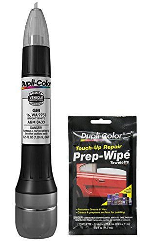 Bundle comes with: One Dupli-Color Bright White General Motors Exact-Match Scratch Fix All-in-1 Touch-Up Paint (0.5 oz) - Use with vehicles that have the following color codes: 16, WA 9753. Allows you to restore a scratch or chip in your vehicles finish. Abrasive prep tip removes loose paint and rust. Contains a primer (0.25 oz) and exact-color match paint (0.25 oz) in one. Clear coat will seal, protect and ensure a perfect factory matched finish Pen tip for fine scratches. Brush end for larger chips. One Dupli-Color Touch-Up Prep Wipe Towelette (8.5" x 11") - Specially formulated to remove oil, wax, grease, and other contaminants from the surface. Cleans and prepares the surface for painting.