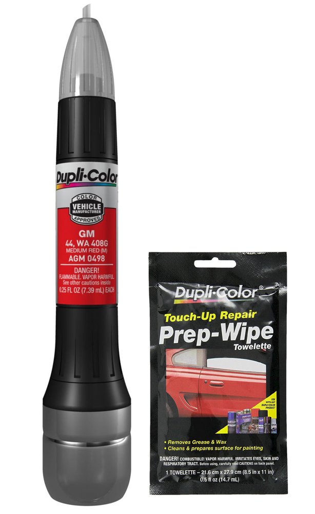 Bundle comes with: One Dupli-Color Metallic Medium Red General Motors Exact-Match Scratch Fix All-in-1 Touch-Up Paint (0.5 oz) - Use with vehicles that have the following color codes: 44, WA 408G. Allows you to restore a scratch or chip in your vehicles finish. Abrasive prep tip removes loose paint and rust. Contains a primer (0.25 oz) and exact-color match paint (0.25 oz) in one. Clear coat will seal, protect and ensure a perfect factory matched finish Pen tip for fine scratches. Brush end for larger chips. One Dupli-Color Touch-Up Prep Wipe Towelette (8.5" x 11") - Specially formulated to remove oil, wax, grease, and other contaminants from the surface. Cleans and prepares the surface for painting.