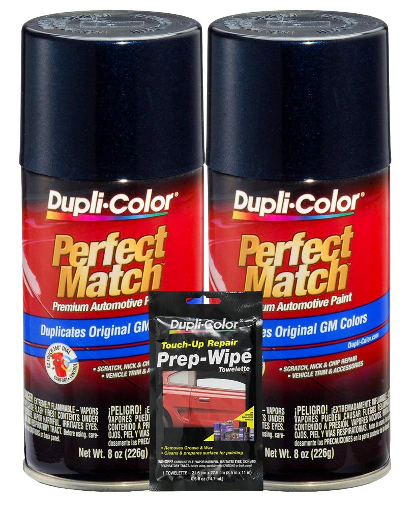 This kit comes with 2 - Dupli-Color (BGM0500) Dark Ming Blue Metallic General Motors Exact-Match Automotive Paint - 8 oz - Dupli-Color Perfect Match Premium Automotive Paint is an easy-to-use, high-quality, fast-drying, acrylic lacquer aerosol paint specially formulated to exactly match the color of the original factory applied coating. Ideal for use on all OEM paint surfaces, Perfect Match is available in a complete line of exact-match colors for current and late model import and domestic vehicles, making this product ideal for both small scale vehicle touch-up and for painting vehicle accessories. For the final step in the exact color match process and to provide additional gloss and protection, finish with Dupli-Color Perfect Match Clear Coat. Plus comes with 1 Dupli-Color Prep-Wipe Towelette, specially formulated to remove oil, wax, grease, and other contaminants from the surface. A must for any paint project because it cleans and prepares the surface for painting.