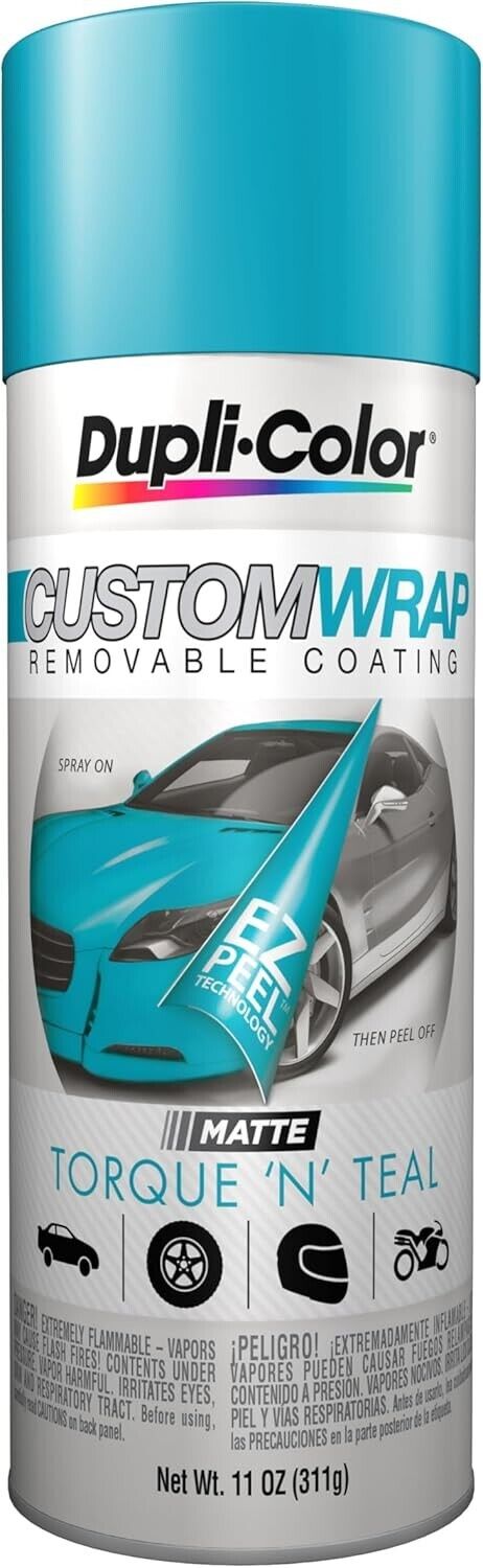 Upgrade your vehicle with the Dupli-Color ECWRC8057 Custom Wrap Removable Auto Spray Paint in an eye-catching Matte Torque 'N' Teal finish. This 11oz. aerosol can is designed for universal application on a variety of surfaces including aluminum, metal, and plastic, making it a versatile choice for car enthusiasts and professional painters alike.