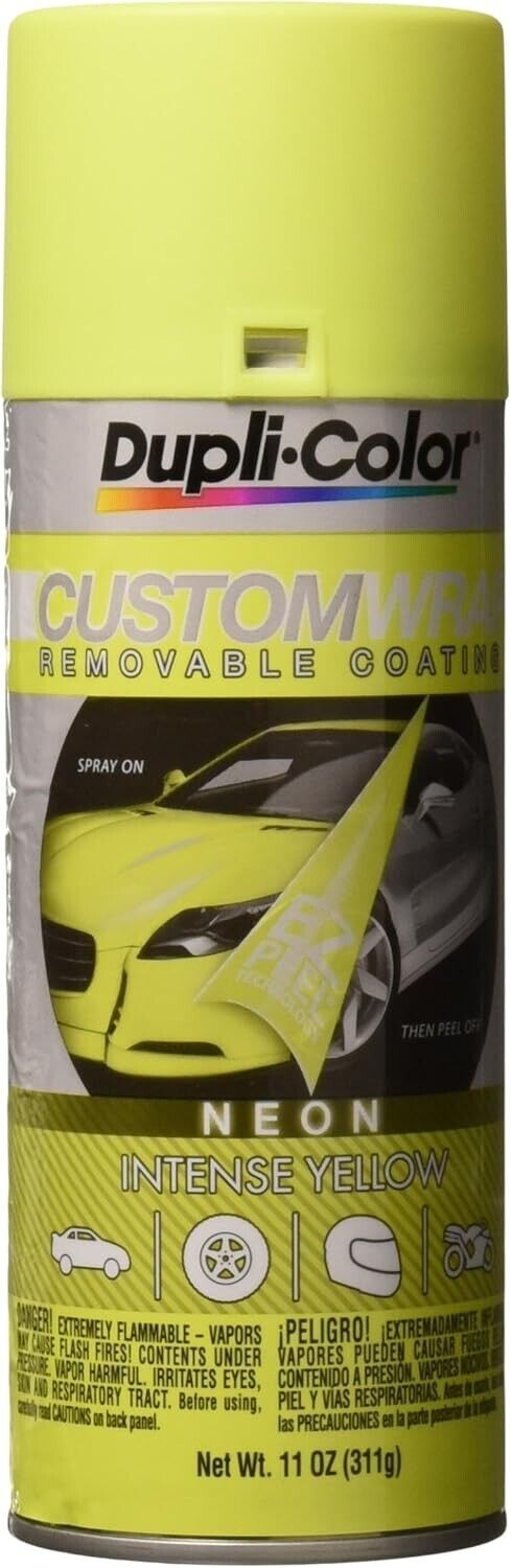 This DUPLI-COLOR Intense Yellow Removable Coating Spray Can is the perfect addition to your automotive paint collection. With the ability to custom wrap any volume, this paint is ideal for those looking to add a pop of color to their cars. The manufacturer color name is intense yellow and the manufacturer part number is CWRC861.