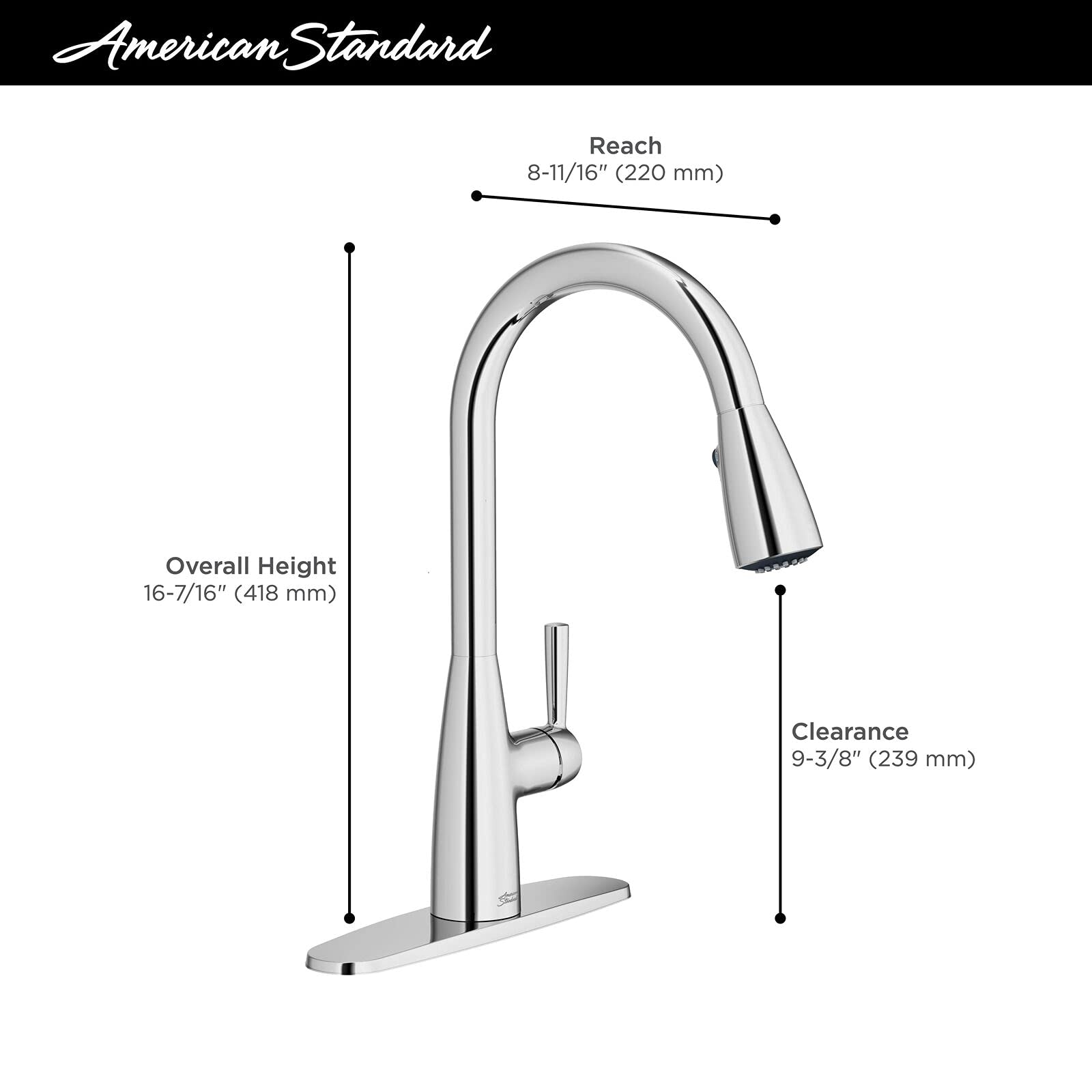 The Fairbury 2S Single-Handle Pull-Down Dual Spray Faucet from American Standard updates your kitchen with its sleek style and the superior functionality that is essential in every kitchen. This high-arc faucet with swivel spout makes it easy to fill large pots. Ergonomic, pull-down spray head provides a comfortable grip and features push-button access to stream, spray and pause functions. Re-Trax system makes pull-down and retraction of spray head smooth and easy. The Fairbury 2S Faucet is easy to install in kitchens with 1, 2, 3, or 4-holes in the sink or countertop, making it the perfect choice for any faucet refresh. - High-arc swivel spout to easily fill and clean large pots - Swivel spout and pull-down spray head reach every corner of the sink - Re-Trax system provides smooth, easy motion when pulling out and retracting spray head - Pull-down spray head with push-button to switch between stream and spray - Ceramic disc valve assures smooth control and a lifetime of drip-free, maintenance-free performance - Memory position valve to turn water on and off at preferred temperature without readjusting handle position - Speed Connect hoses easily snap together for a watertight connection - Flexible and durable, the 38-inch supply lines resist wear and tear, included - Durable metal construction - ADA compliant lever handle