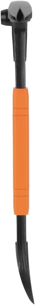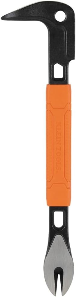 The Klein Tools 66092 Nail Puller with Integrated Dimpler is a 10-inch tool made of carbon steel. It features an orange color and has a unique design that includes both a nail puller and a dimpler. The tool has a height of 10 inches, a diameter of 0.63 inches, a length of 2.5 inches, and a width of 1 inch. This product is ideal for removing nails and making dimples in various materials, making it a versatile and efficient tool for any workshop or home improvement project.