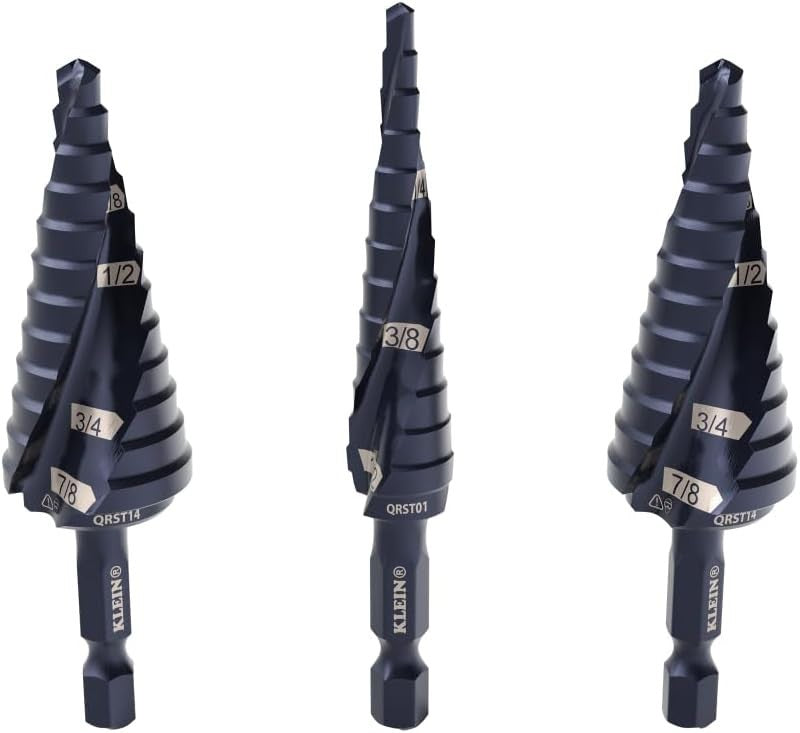 The Klein Tools Step Drill Bit Set includes 3 pieces with a quick-release design for easy bit changes. Made of steel, these double fluted step bits are suitable for drilling and cutting applications. The set is designed for use with a drill and features a sleek black color. The brand, Klein Tools, is known for producing high-quality tools, and this set is a valuable addition to any workshop or tool collection.