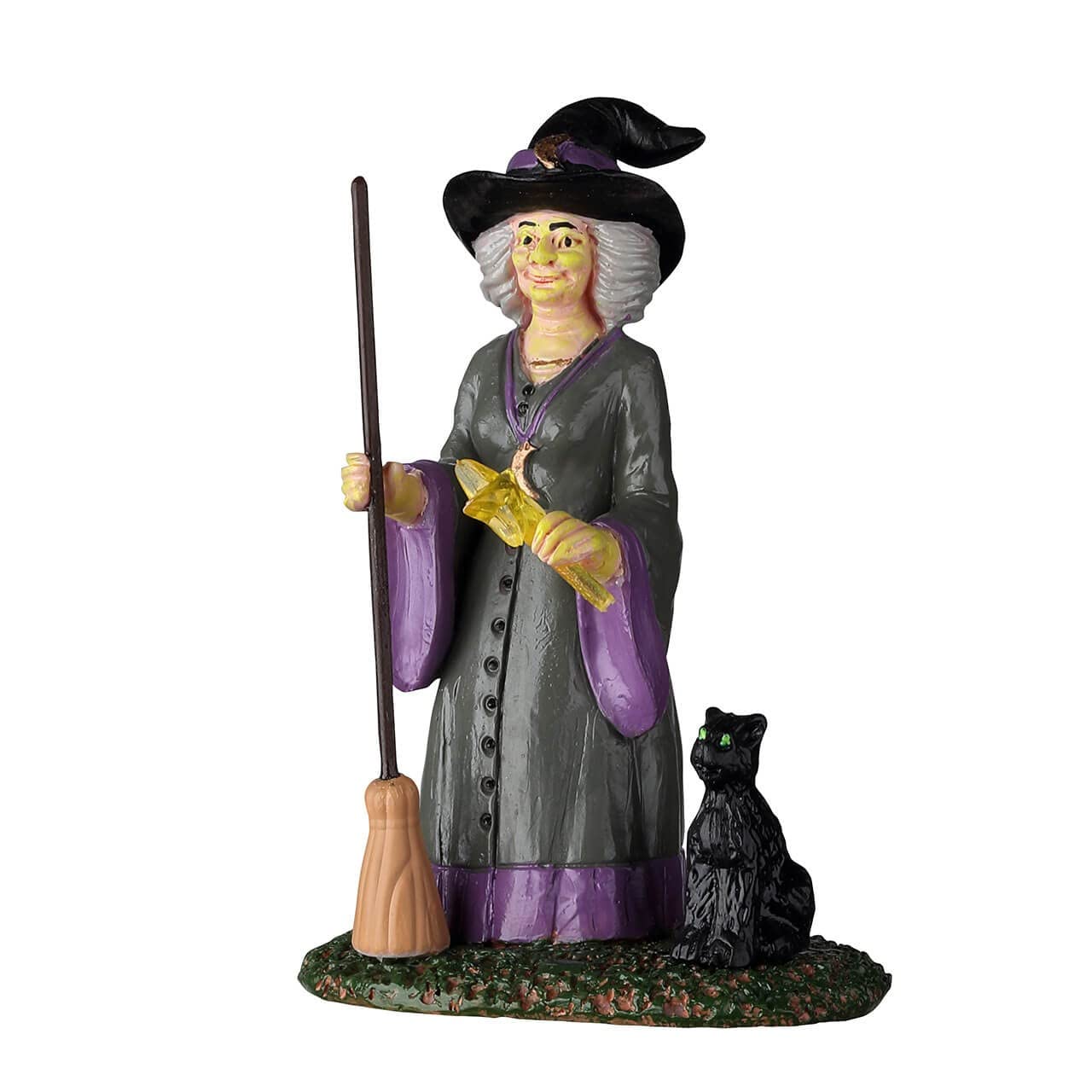 This features a witch holding a wand and a broom. Her black cat sits nearby