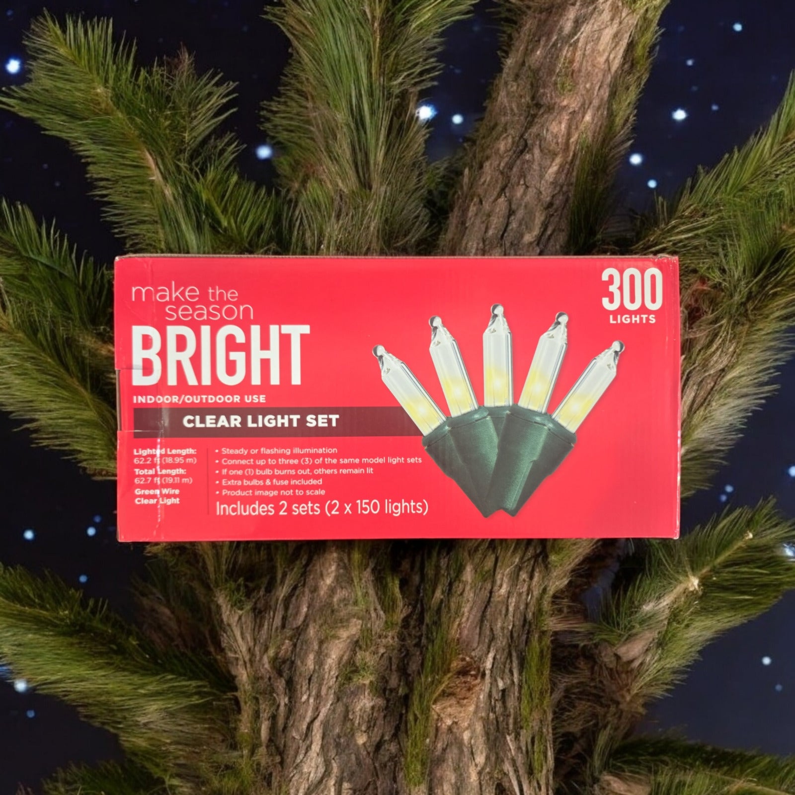 Brighten up your indoor and outdoor space with this amazing Make The Season Bright Indoor/Outdoor Clear Light Set. The set includes two strings of 150 clear white lights in a bottle shape, perfect for adding a festive touch to your Christmas decorations. The lights are electrically powered and can be easily controlled with a wall switch, making it convenient for any occasion.