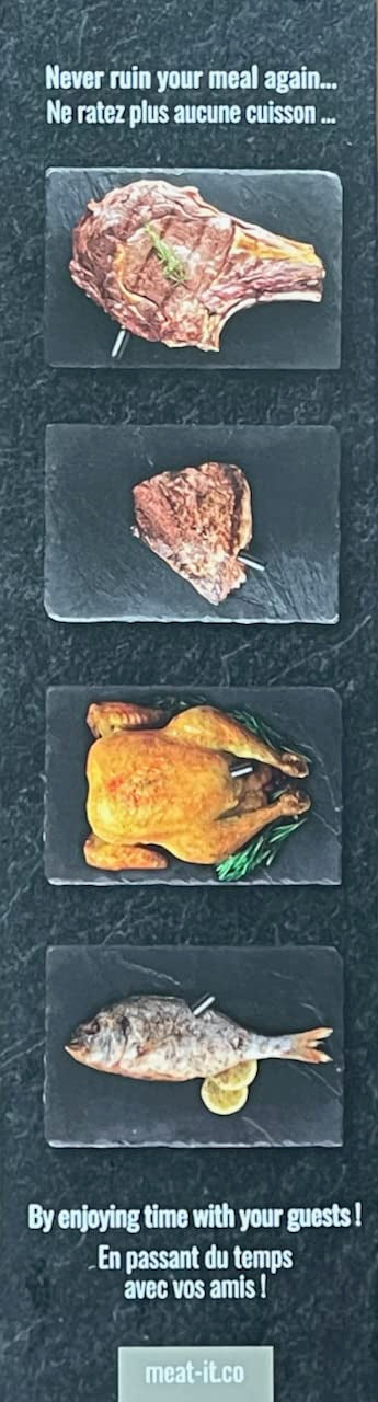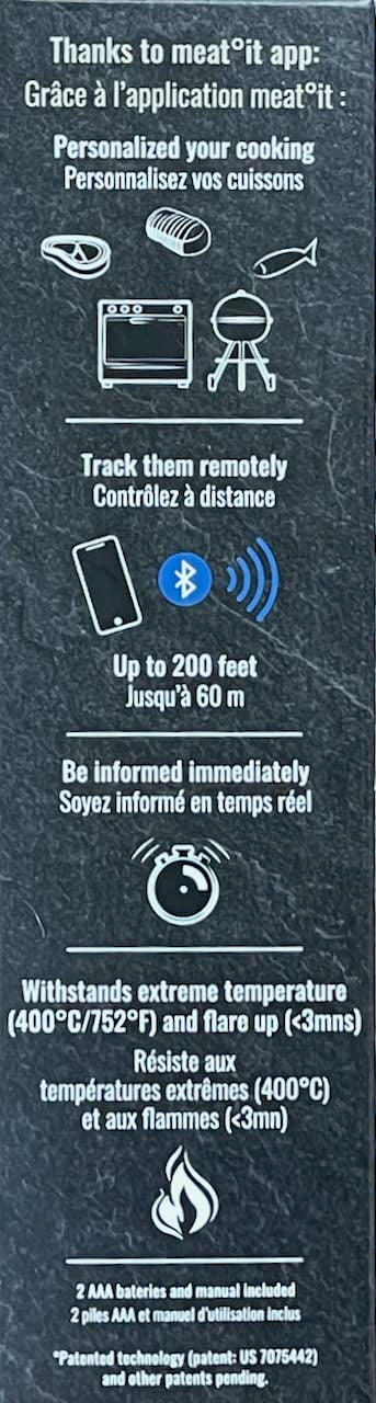 meat°it + is a smart wireless thermometer that has been designed to offer a perfect and precise cooking session. Thanks to meat°it + you can enjoy your time with your guests and never ruin your meal again! Two integrated sensors in the probe to measure both internal and external temperatures. - Smart wireless thermometer with bluetooth - Measure both internal and external temperatures - Precision to the nearest degree - Range up to 60m (30m probe/docking station + 30m docking station/phone) - Delivered with AAA batteries. The probe can withstand extreme temperatures (400°C/752°F) and Flare up (< 3mins).