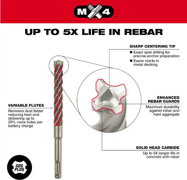 The Milwaukee SDS-Plus 4-Cutter MX4 5/16 in. X 4 in. X 6 in. Drill Bits feature solid carbide heads that deliver up to 5x longer life in concrete with rebar. Engineered with rebar guards to provide maximum durability in hard aggregate and rebar. MX4 4-Cutter bits are designed with sharp centering tips for exact spot drilling in concrete and metal decking. The 4-cutter design prevents lock-up in rebar, reducing downtime. Variable flutes remove dust faster, reducing heat and delivering up to 20% more holes per battery charge. Wear mark indicator shows users the end of life when the bits no longer meet the ANSI requirement. The Milwaukee MX4 4-Cutter Drill Bits are ideal for concrete with rebar and masonry applications.