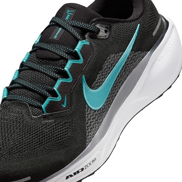 The product is a pair of men's Nike Air Zoom Pegasus 41 running shoes in black and gray, featuring a lace-up closure and a low-top shoe shaft style. These sneakers are designed for casual occasions and athletic activities like walking, trail running, hiking, and jogging. Made with a mesh upper material, foam insole, and rubber outsole, these shoes offer comfort and support for various activities. With a standard shoe width and size 10 US, these Nike Pegasus 41 shoes are a stylish and functional choice for men looking for quality athletic footwear.