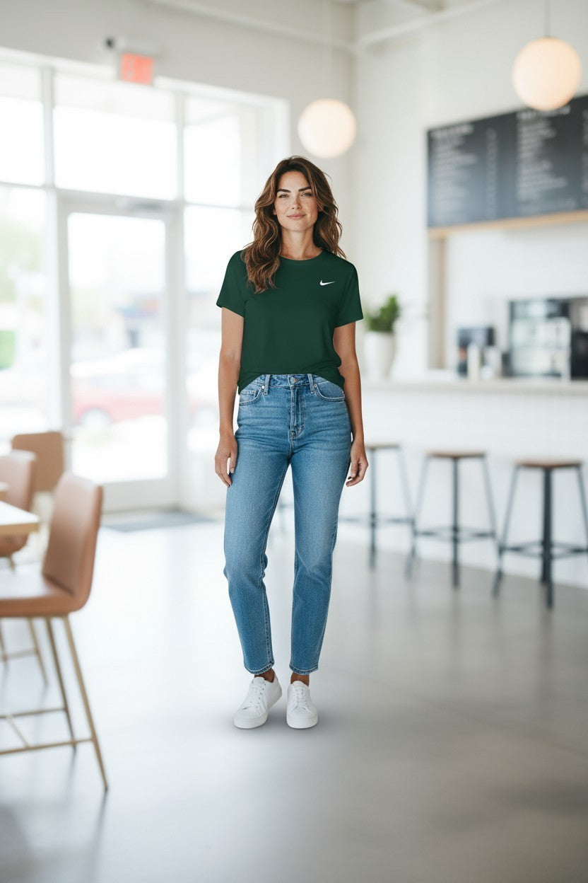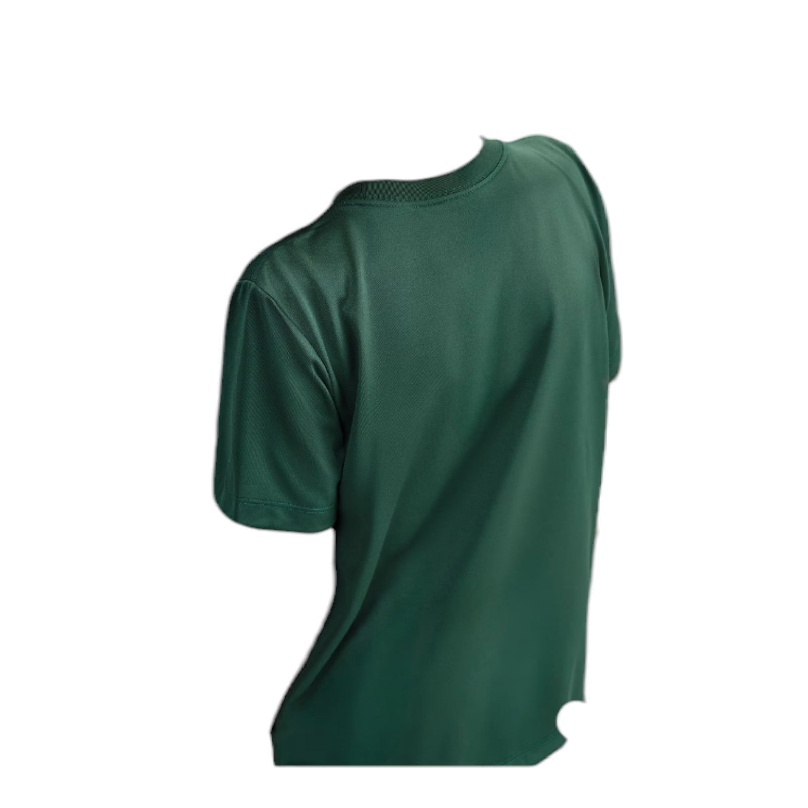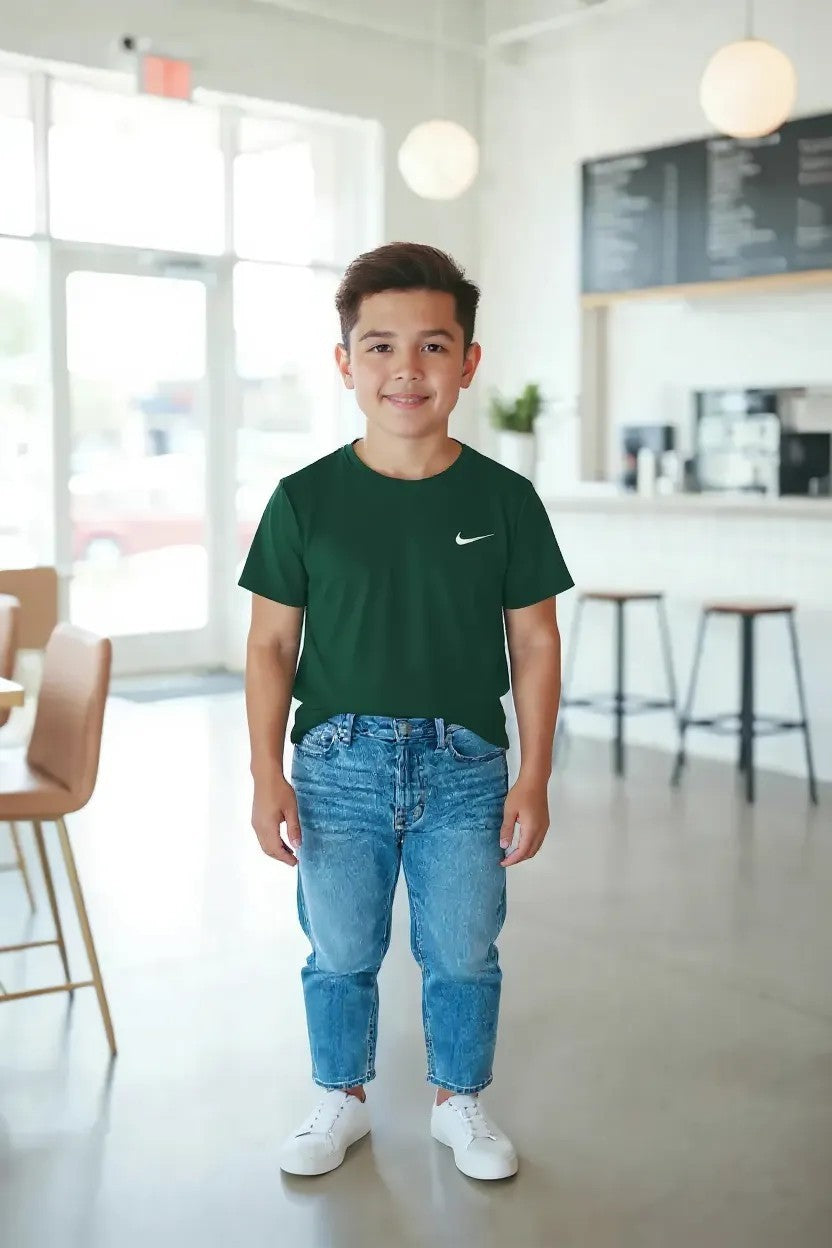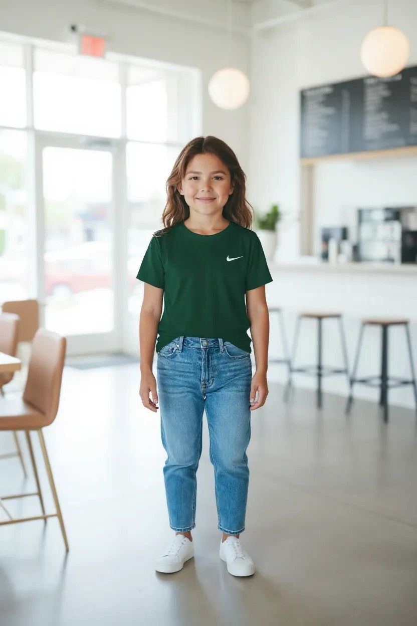The product is a new NIKE Dri-Fit Big Kids' Red Legend Swoosh Training T-Shirt in size S-XL. This lightweight and breathable T-shirt features the iconic Nike Dri-Fit technology, making it suitable for various activities such as gym training, tennis, basketball, and more. The crew neck and pullover style provide comfort and convenience, while the solid green color and logo accents add a sporty touch. Made from recycled polyester, this shirt is machine washable and suitable for all seasons, making it a versatile and stylish choice for active kids.