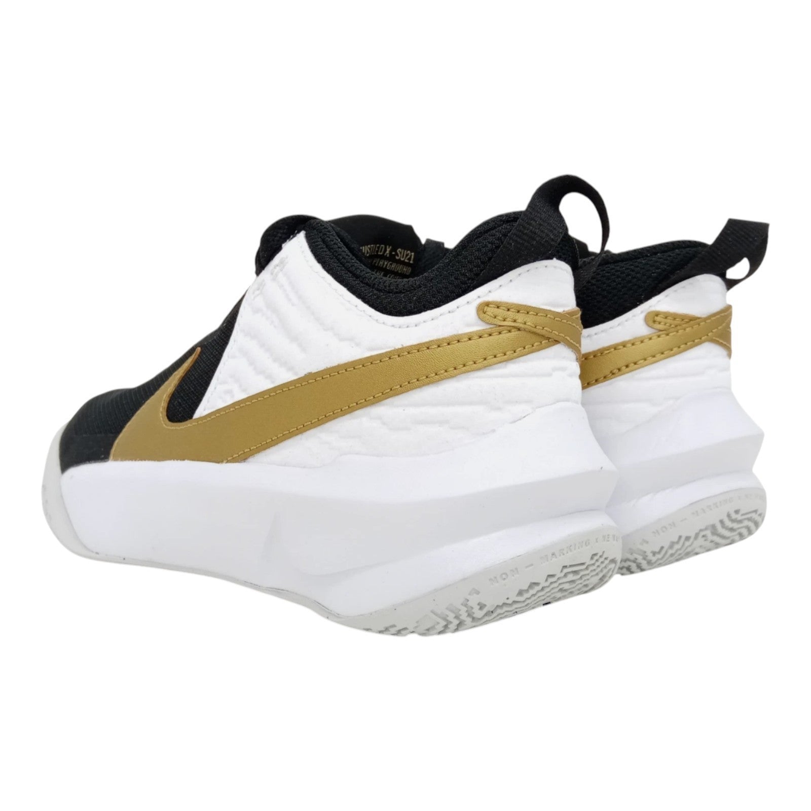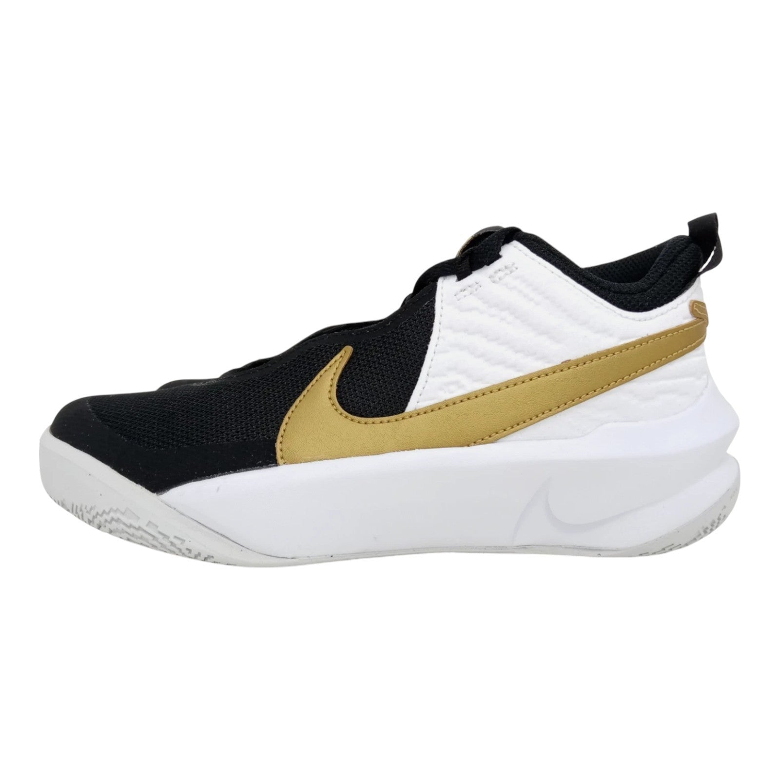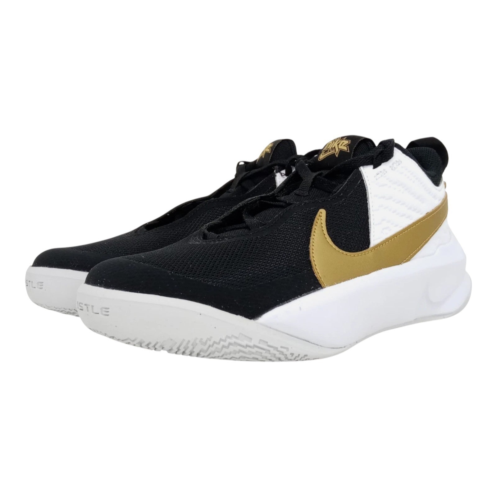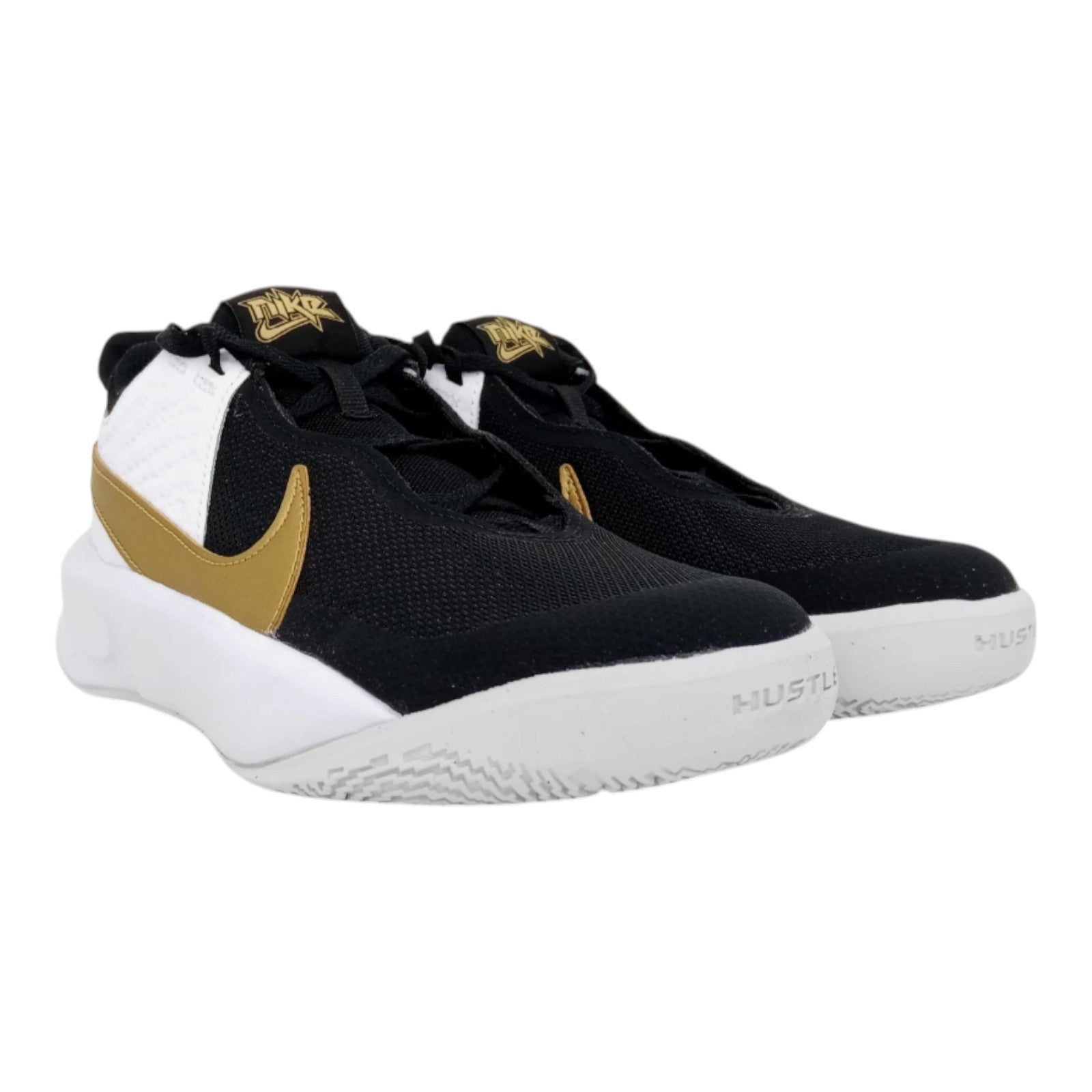 The Nike Kid's Team Hustle D 10 (GS) Basketball Sneakers in size 5Y are a stylish and comfortable choice for young athletes. With a round toe shape, lace-up closure, and adjustable features, these sneakers provide a secure fit for basketball players. Made with a durable rubber outsole, cushioned insole, and breathable fabric lining, they offer moderate comfort and support for active kids. The black color with gold and white accents, along with the Nike logo, adds a sporty touch to the design, making them a versatile choice for various seasons and activities. Ideal for both boys and girls, these sneakers are a must-have for any young athlete.