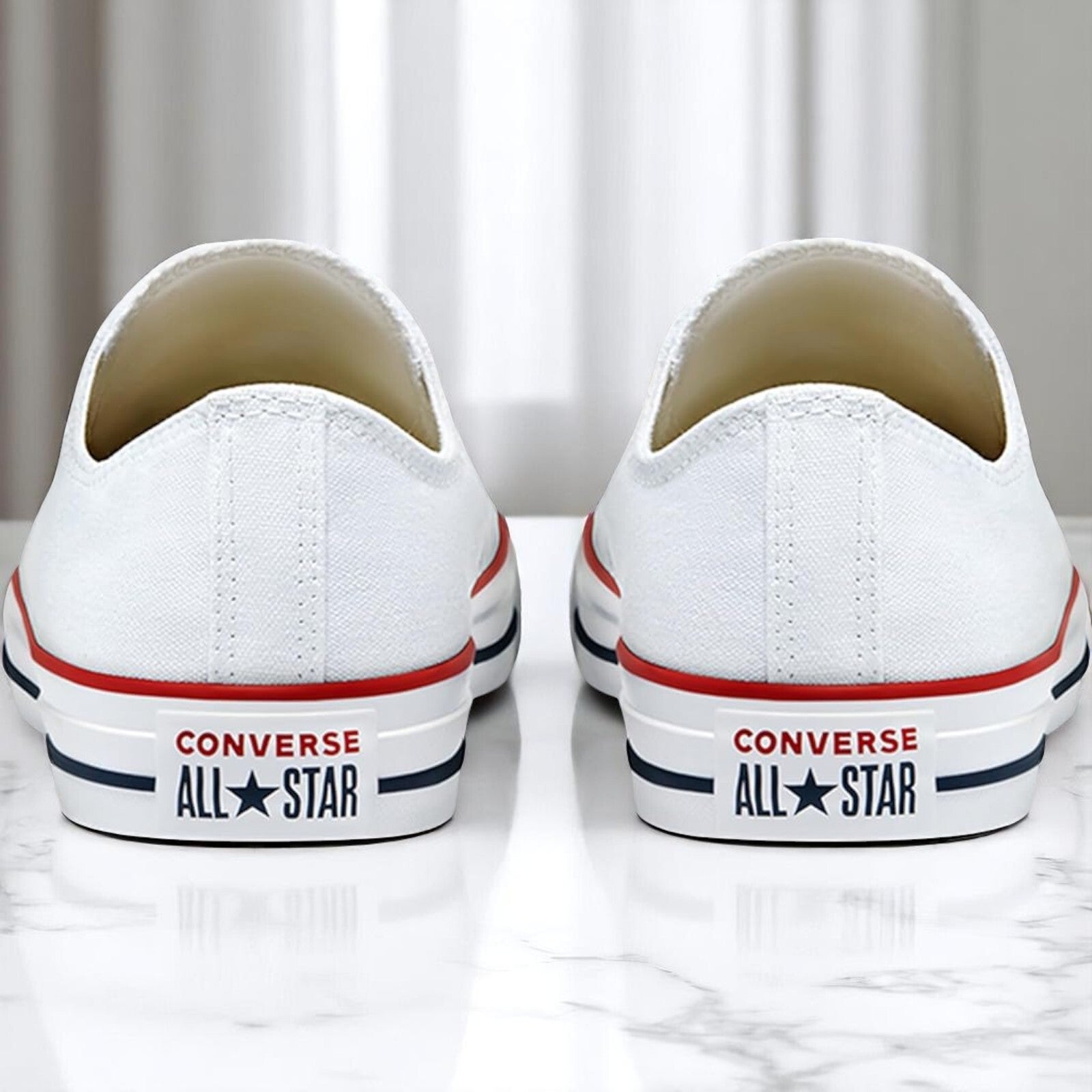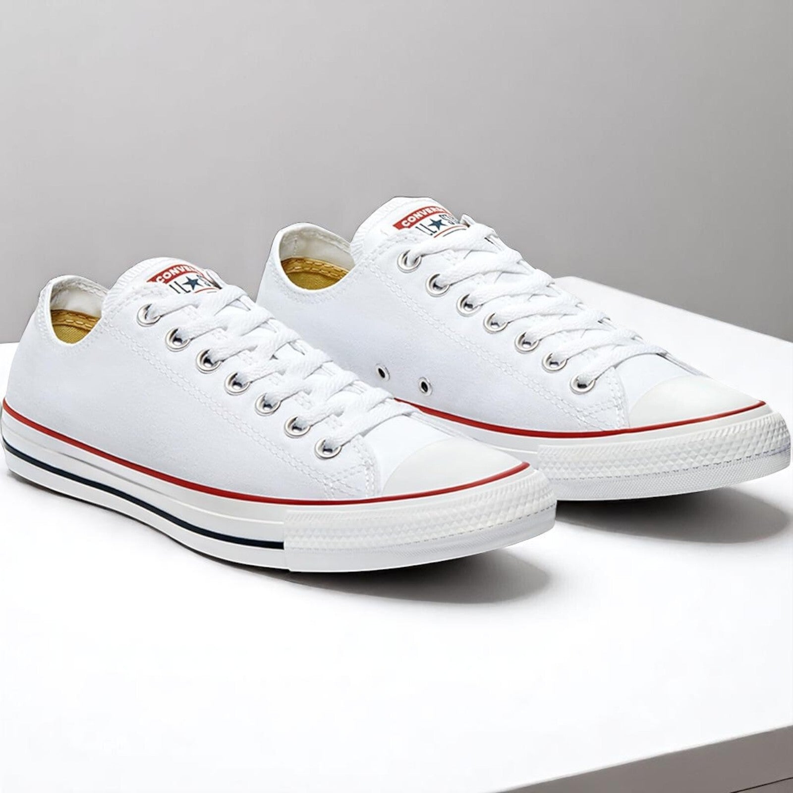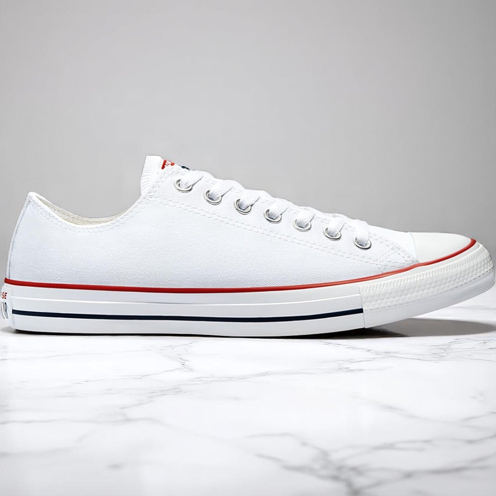 The product is a new unisex pair of Converse Chuck Taylor All Star Classic Low Top sneakers in optical white. These iconic sneakers feature a lace-up closure, rubber outsole, and canvas lining. Perfect for various occasions such as activewear, casual outings, or workwear, these versatile shoes are suitable for both men and women. With a classic solid white color and the signature Converse brand, these athletic sneakers are a timeless addition to any wardrobe, ideal for wearing in the summer, fall, or spring seasons.