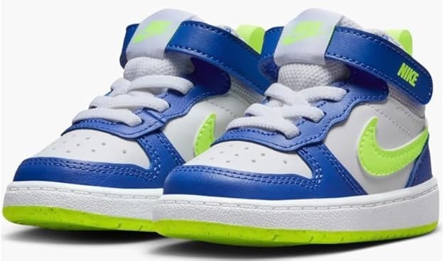 The Nike Court Borough Mid 2 Shoes in Youth Size 10C are a stylish and comfortable choice for young basketball players. These white and blue sneakers feature a round toe shape, hook and loop closure, and moderate cushioning level for added support during games. The rubber outsole provides traction, while the foam insole ensures a comfortable fit for casual occasions or sports activities. With the iconic Nike logo accents and athletic design, these shoes are perfect for the summer, fall, and spring seasons.
