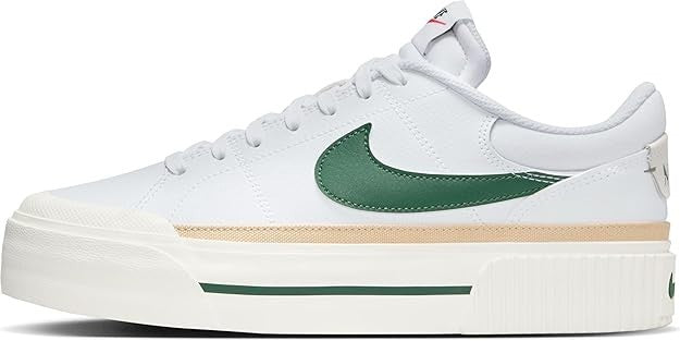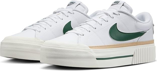 The Nike Court Legacy Lift Women's Shoes in White/Sail/Sesame/Fir, Size 7.5 are stylish and versatile sneakers perfect for activewear or casual occasions. Made with a blended fabric upper and featuring a rubber outsole, these shoes offer comfort and support for various activities like walking, cross-training, and running. With a lace-up closure and low-top shoe shaft style, these athletic shoes are a great addition to any woman's wardrobe. The timeless design and quality construction of Nike make these shoes a reliable choice for a range of seasons.