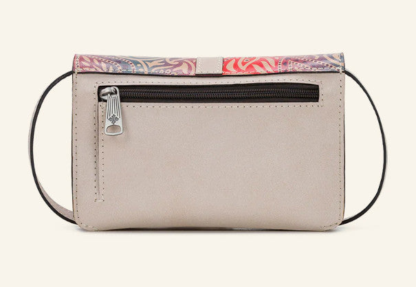 Crafted for the modern woman, the Patricia Nash Torri Leather Crossbody in Chalk White with Greek Ombre design marries sophistication with functionality. The faux suede exterior is complemented by a sophisticated gold hardware finish, while the interior boasts a golden faux suede lining, ensuring a cohesive and luxe look. With a rectangular shape and a magnetic snap closure, this small-sized bag keeps your essentials secure and within reach.