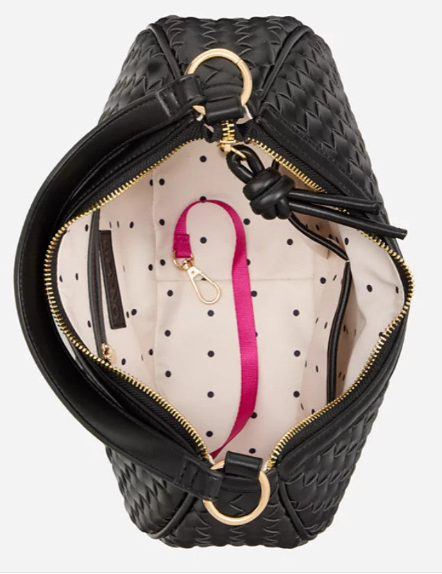 Crafted for the modern woman, the On 34th Woven Crossbody Hobo in classic black is a harmonious blend of style and functionality. Its polyurethane exterior and matching black lining offer a durable and sleek look, while the woven pattern adds a touch of elegance. The bag is thoughtfully designed with a zip closure, adjustable crossbody strap, and a comfortable handle drop of 8.5 inches, ensuring it sits perfectly on your shoulder.
