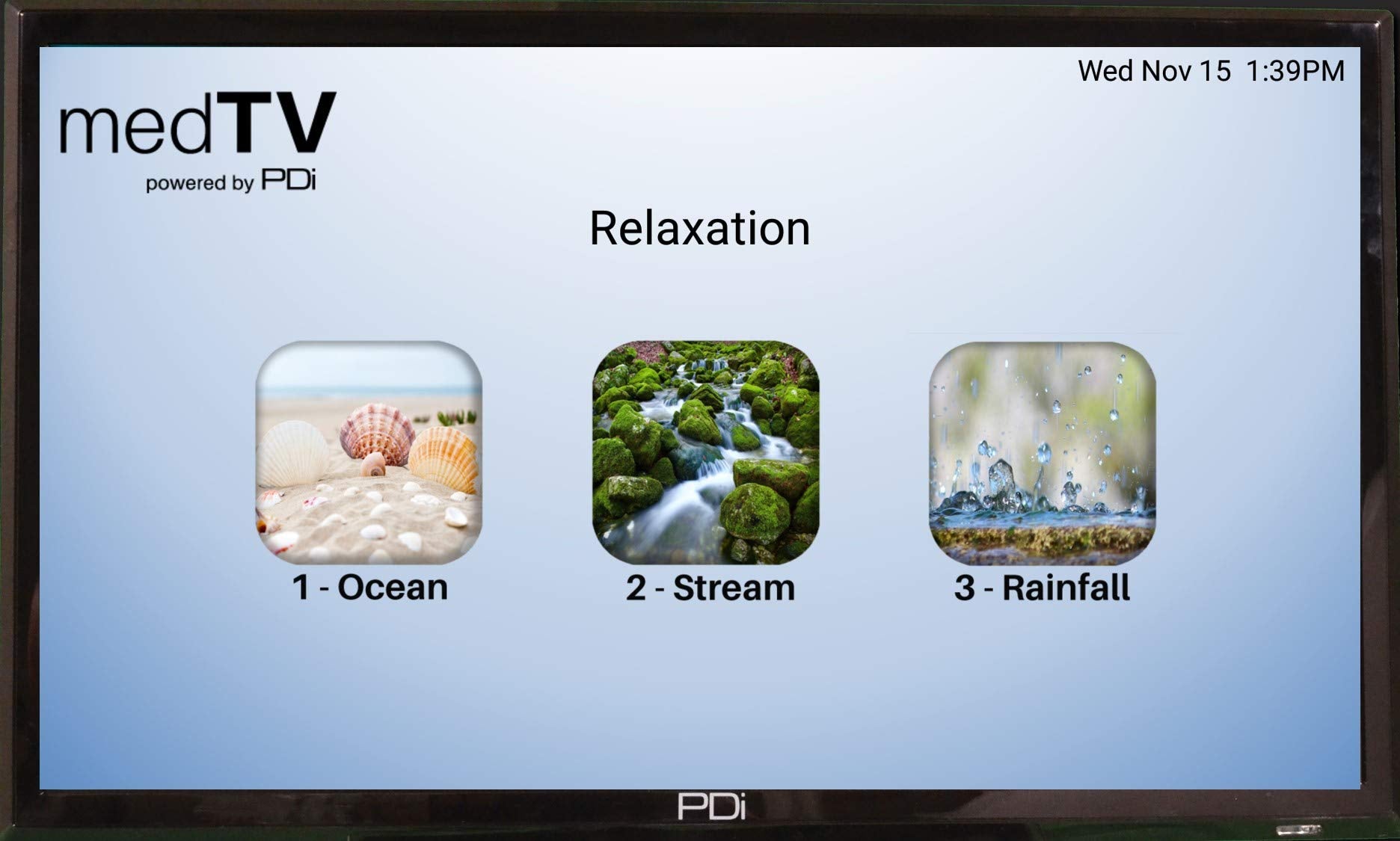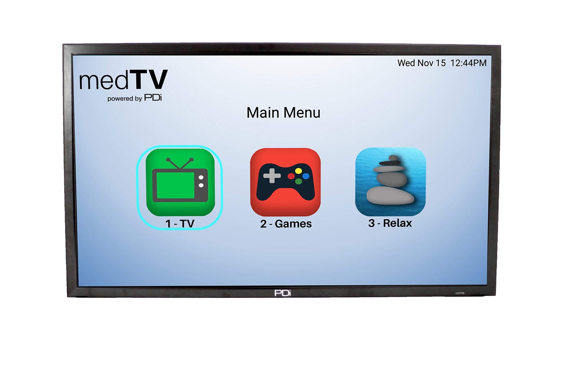 Delivering a high-quality patient TV experience that offers modern app-based technology and current TV programming is the simplest solution to satisfy patients, with minimal staff time investments. The medTV UL-Listed SMART healthcare-grade HDTV by PDi integrates eight game apps and three relaxation apps out-of-the-box, no internet required. Who doesn’t enjoy a bit of distraction with fun trivia? Also, research shows that soothing nature sounds help patients rest well and heal faster. This smart healthcare television can be set up as simple TV only or with the enhanced medTV apps. With easy numeric or navigational pillow speaker controls, the patient can easily switch from regular TV programming to fill their room with the sounds and images of rushing streams, relaxing waves or soft rain to help ease anxieties and drown out disruptions from other sounds in the hospital surroundings. The medTV SMART has ATSC, NTSC and Clear QAM, as well as MPEG4 and Pro:Idiom. The 32" black metal cabinet is 29.6” x 17.9” x 2.2”, and the TV weighs less than 15 lbs. It has a 100x200 VESA pattern with 6 mm threads and an optional DVD module. Available screen sizes 24”, 32”, 43” and 55”. When you are ready for more interactive features, GENiO cloud-based software subscription can upgrade to a full interactive Smart TV or use with leading interactive patient software systems. Includes Standard TV Wall Mount PD168-079 and 1 free PD108-420 programming remote per order.