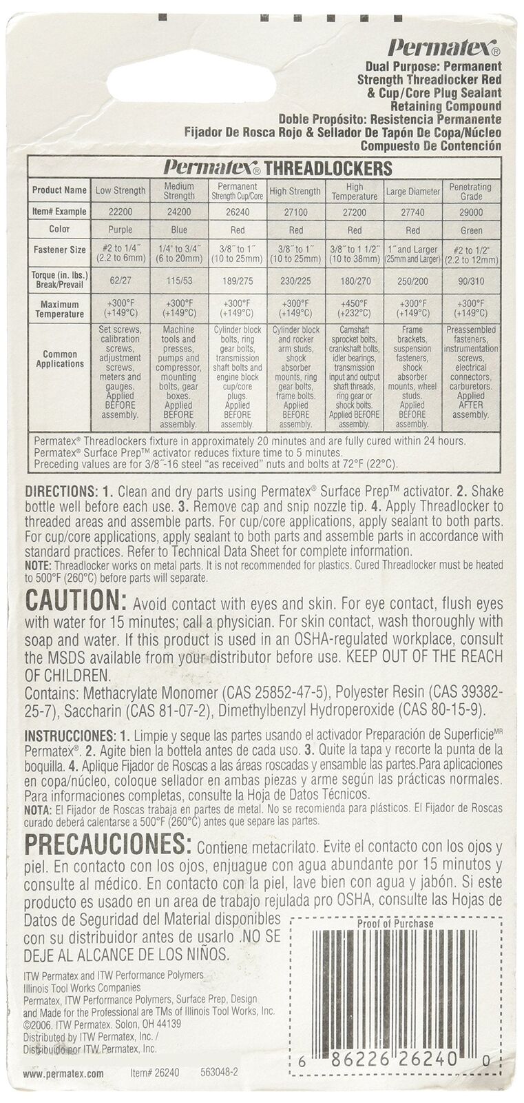 Permatex 26240 Permanent Strength Threadlocker Red, 36 ml Bottle
