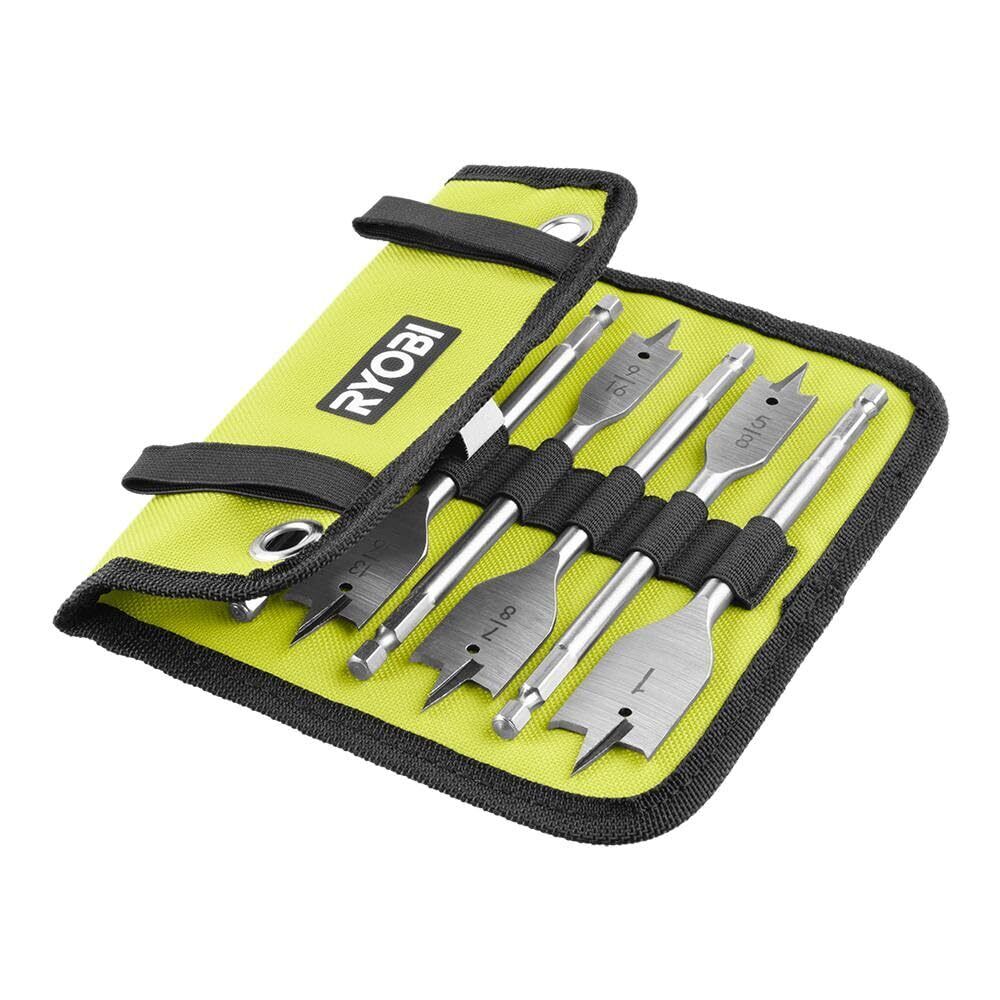 Ryobi introduces the 10 PC. Wood Spade Bit Set. This set is perfect for wood drilling applications. The spade bits feature a 1/4 in. hex shank that is compatible with all drills and impact drivers. Providing up to 3X faster drilling, this set is equipped will all your projects needs. It includes a storage mat for additional organization on and off the jobsite. The double wing spurs on the spade bits provide easy hole formation and prevents break out. This assorent is perfect for all of your projects including wood surfaces.