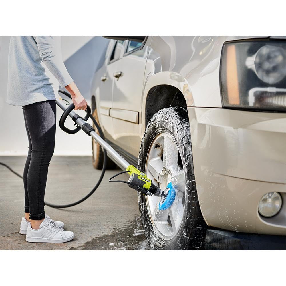 Enhance your RYOBI 18V ONE+ System with the 18V Soap Dispensing Telescoping Scrubber. Pick up this motorized scrubber and leave the sponges in the garage along with the backache that comes along with traditional cleaning methods. The cordless portability and lightweight design is perfect for cleaning on the go. The convenience of the 18V Soap Dispensing Telescoping Scrubber is having the power to do it all with cordless freedom; spray the included RYOBI Soap Solution, turn on the scrubber and let it do the work. This improved telescoping scrubber gives an effortless cleaning experience with soap and water dispensing technology. It is compatible with over 25 Hex Shank and Triangle Connector accessories – ranging from plush microfiber to abrasive bristles (sold separately). The included 6 in. Medium Bristle Brush is ideal for cleaning tile, fiberglass, siding, and more. The 6 position pivoting head and 51 in. telescoping pole allows cleaning in hard to reach areas. Clean with confidence knowing the scrubber’s battery enclosure is IPX7 Water Resistance Rated, meaning this tool can be submerged in up to 3 feet of water for 30 minutes. Best of all, it is part of the RYOBI 18V ONE+ System. Battery and charger sold separately.