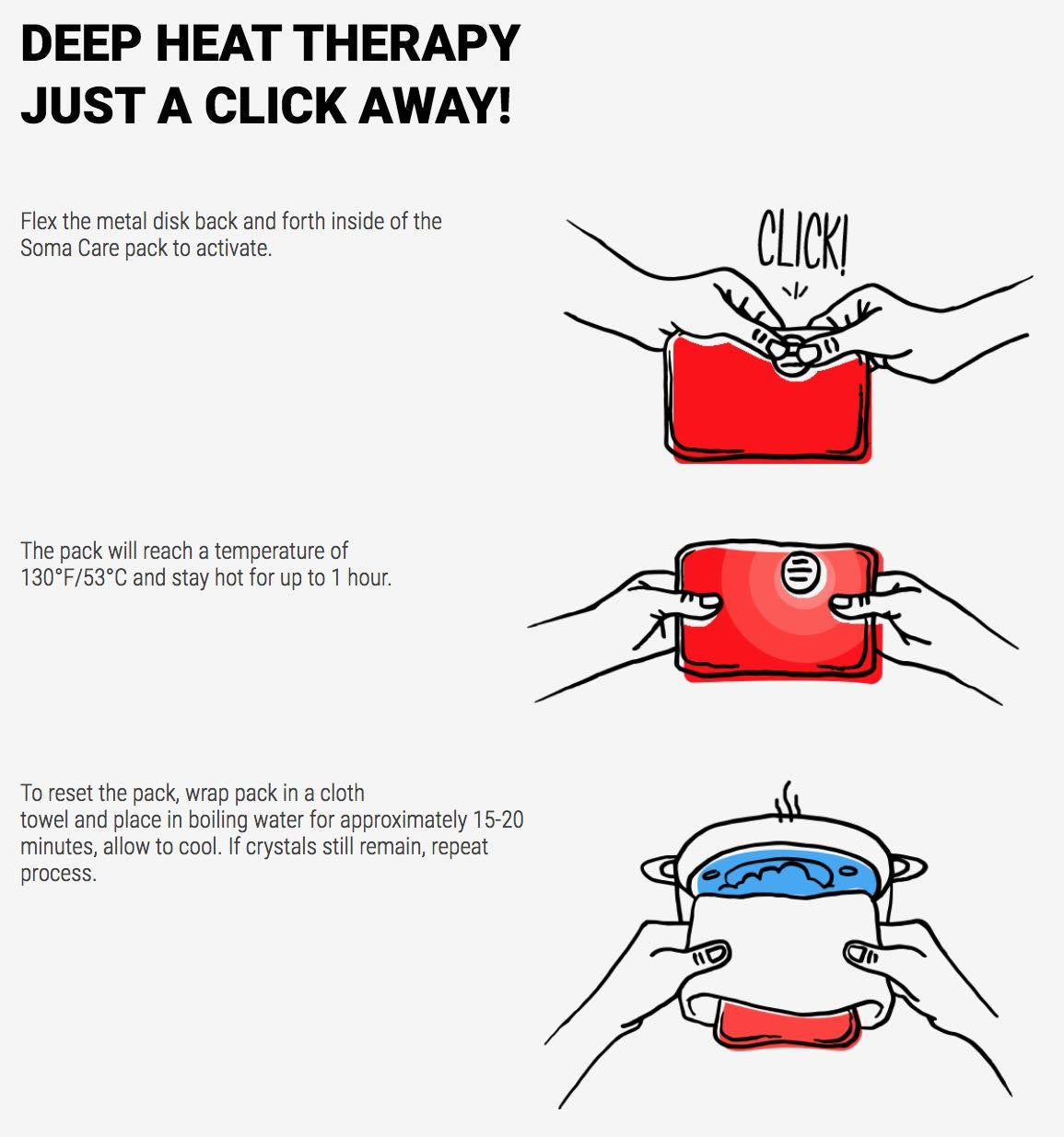 To activate heat therapy, find the metal disk inside the pack and flex it back and forth. The pack will reach a temperature of 130?F/53?C and stay hot for up to 1 hour. To reset the pack after use, wrap it in a cloth towel and place in a container of boiling water for 15-20 minutes. Allow to cool.