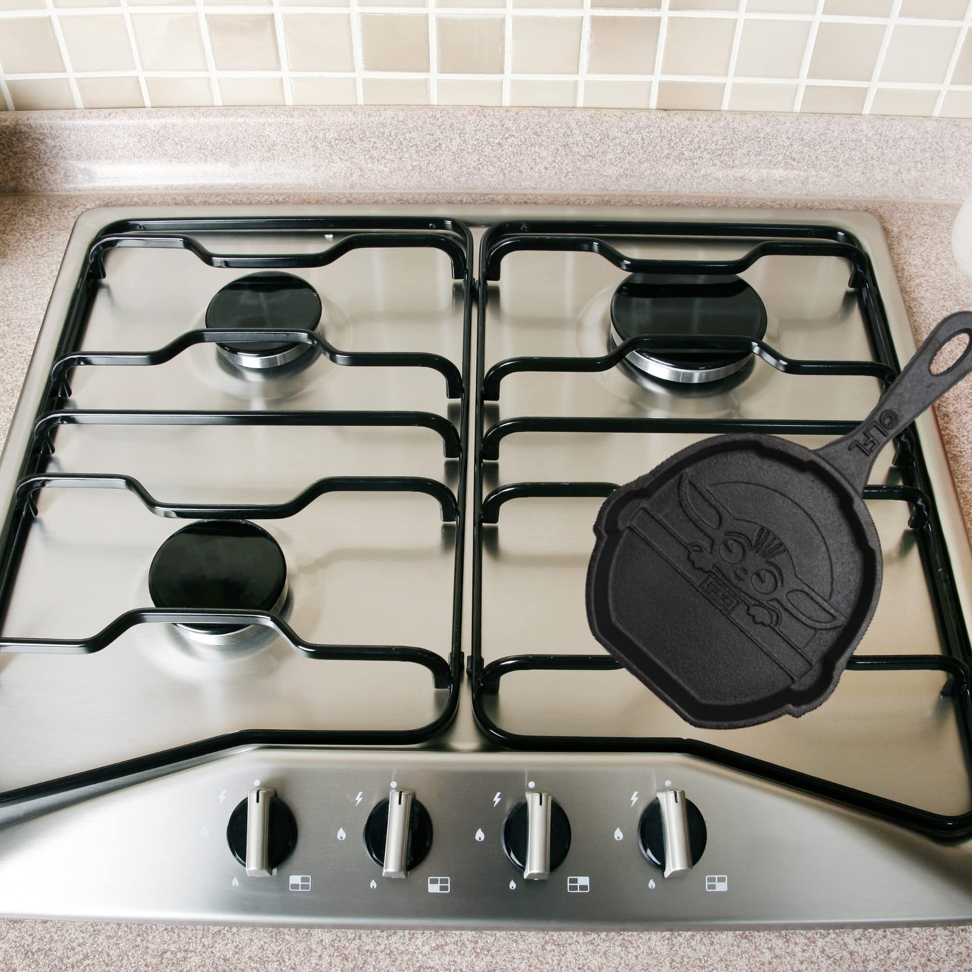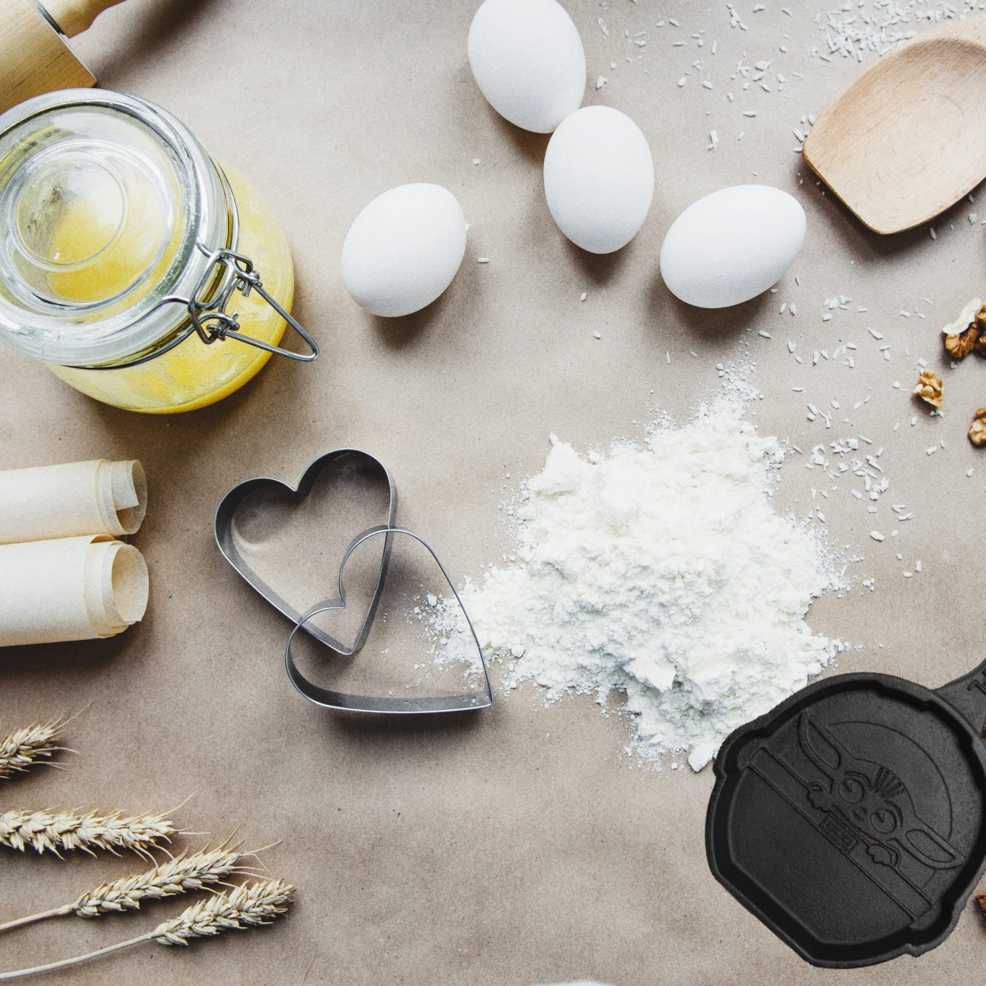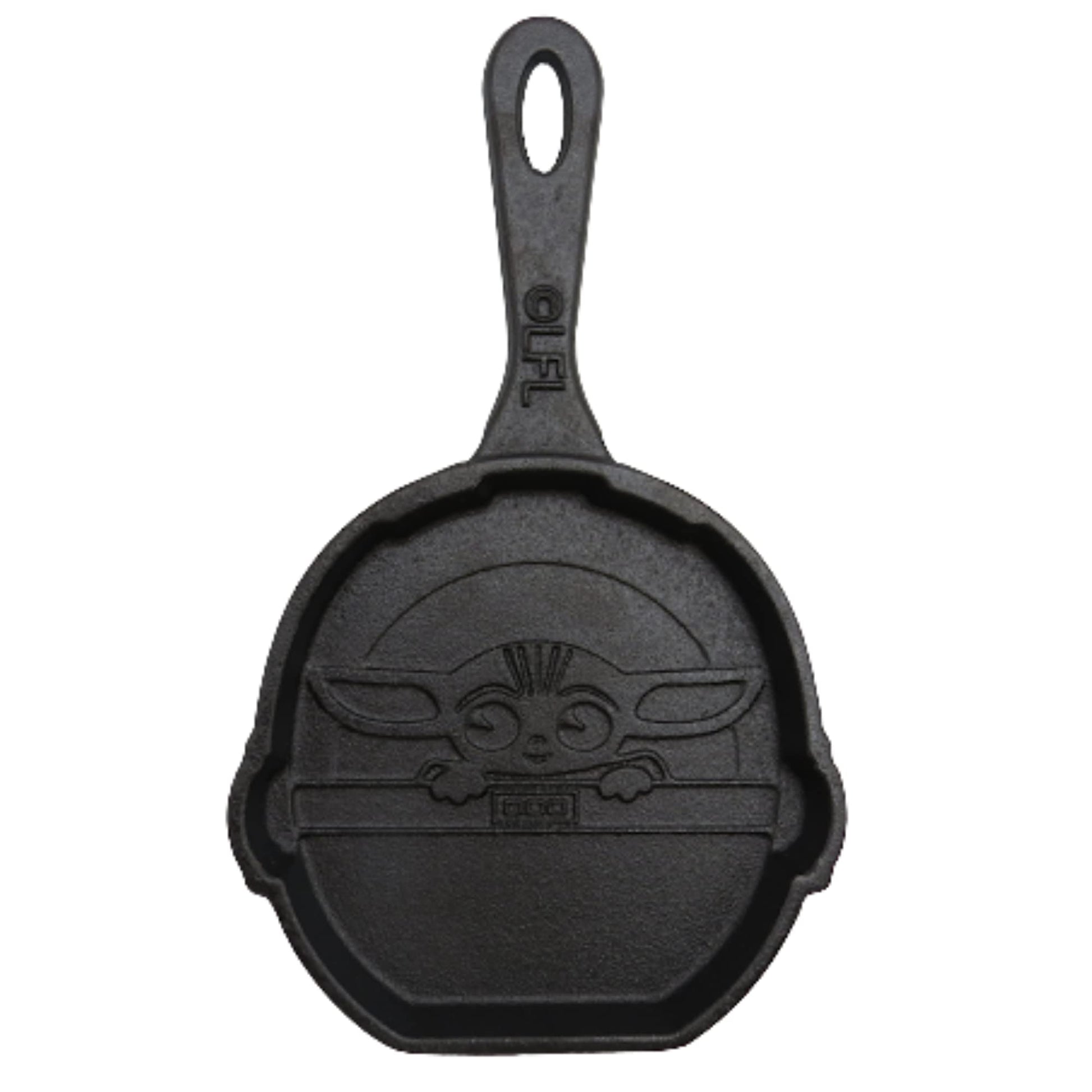 THE CHILD Do your kids live and breathe Star Wars? Start their day off right with Baby Yoda shaped pancakes! KIT INCLUDES Gift set has one cast iron skillet, cooking instructions, and a bag of pancake mix that makes 4 pancakes. USE Before first use, preheat oven to 350F. Wash with soap and water to completely scour. Lightly coat with vegetable oil inside and out. Place skillet in the oven. Let the oil bake into its surface for 2 hours. Remove from skillet to cool. For best results, repeat two or three times. Store in a dry place. GIFT SET is perfect for friends, family, or loved ones who enjoy baking, or are fans of Star Wars The Mandalorian. SKILLET measures 9 inches in size with handle and are 4.25 inches in diameter. It is engraved with the image of the Child from the Mandalorian. The skillets prints the image on pancakes after they are cooked!