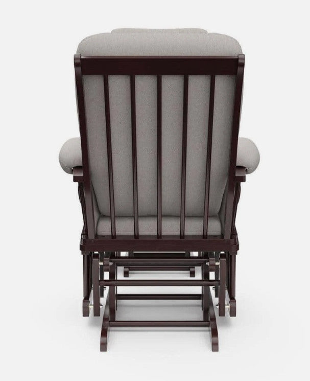 The StorkCraft Tuscany Custom Glider and Ottoman in Espresso and Taupe is a traditional-style wood furniture set that includes a glider and ottoman. The set features a rich brown color and a comfortable wood firmness, making it suitable for various rooms in the home such as the bedroom, living room, or porch. The glider has a 22.5-inch backrest height and a 29-inch length, with a 38-inch height and 35-inch width. This set from Storkcraft is a stylish and functional addition to any space, perfect for rocking and relaxing.