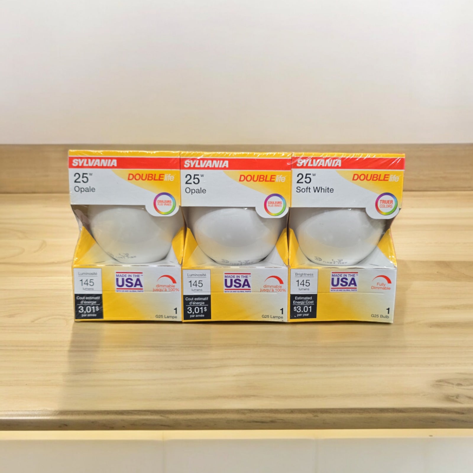 Sylvania 25 W Double Life G25 Dimmable Bulbs, Soft White, 3 Pack!