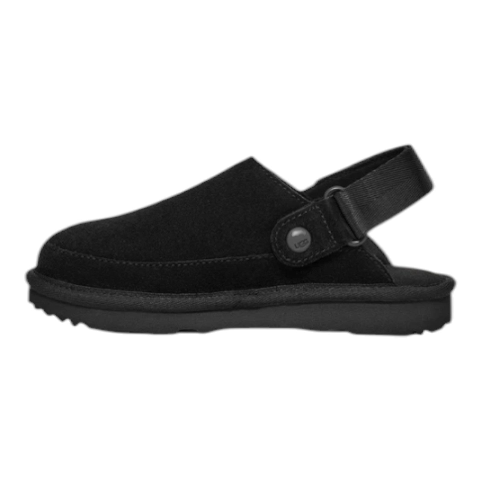 The Ugg Kids' Goldenstar Clog Slippers in Sand/Chestnut/Black are stylish and comfortable slip-on shoes designed for big kids. With a low top shoe shaft style and closed toe shape, these slippers are perfect for casual wear or travel. Made with sheepskin lining and suede upper material, they provide warmth and a cozy feel. The rubber outsole ensures durability, while the flat heel style provides support for walking activities. Ideal for all seasons, these Ugg clog slippers are a fashionable choice for girls looking for both style and comfort in their footwear.